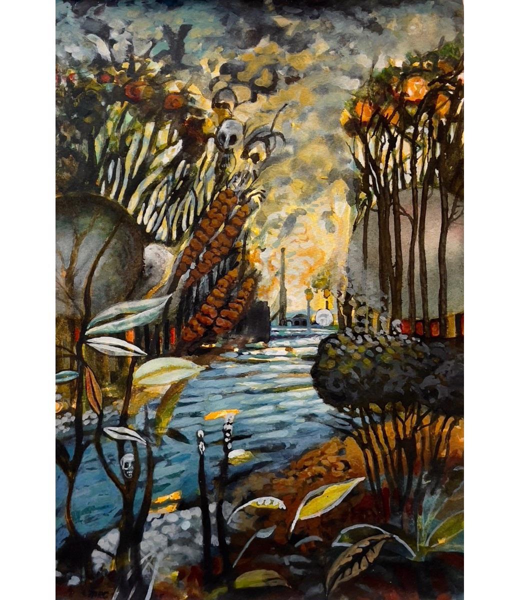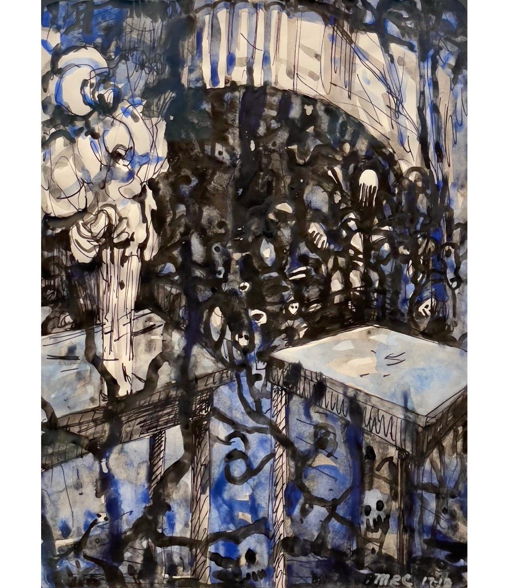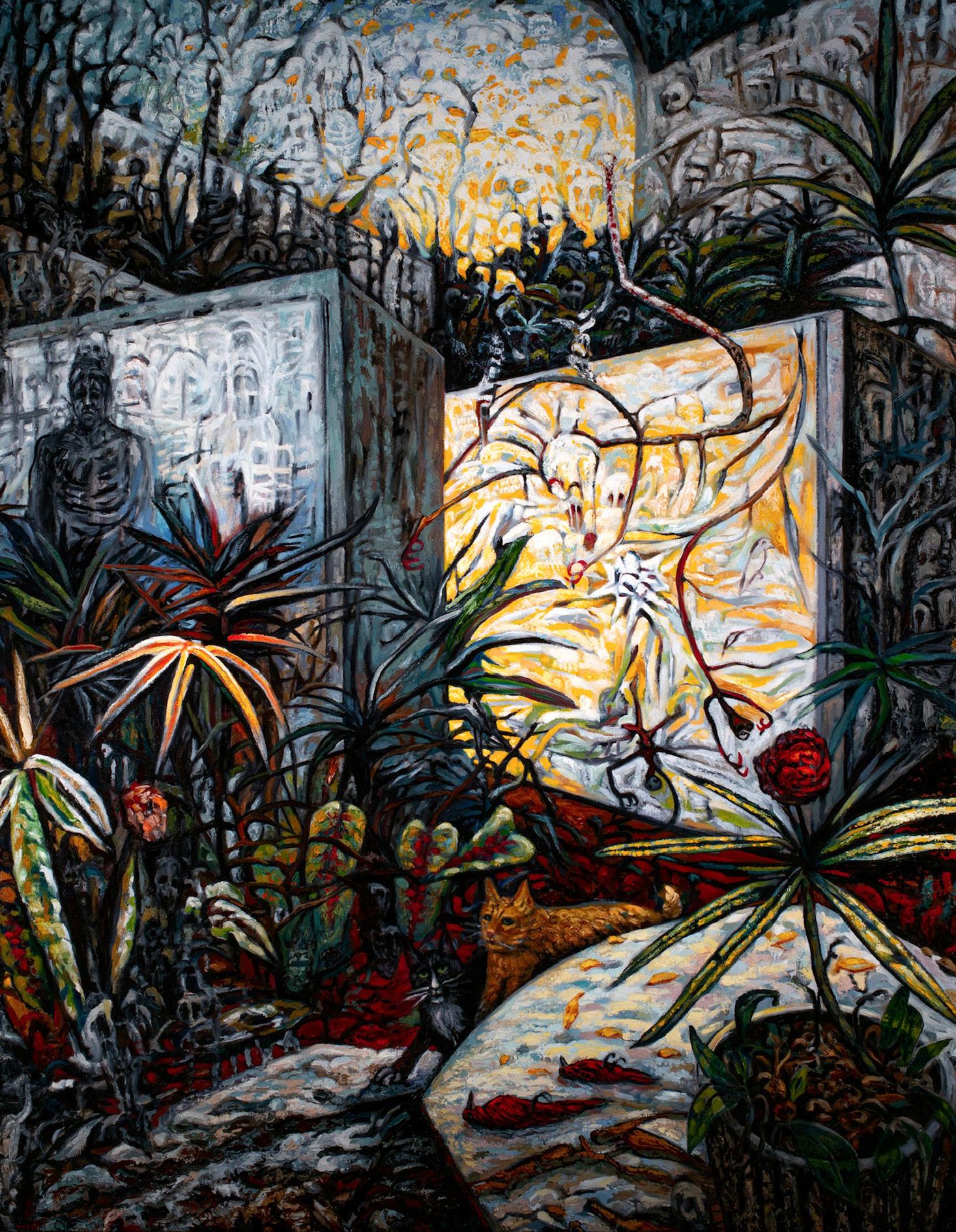 Floating between allegory and abstraction, Collins’ paintings are inhabited by the recurring forms of decaying architecture, coastal relics, ritual figures, and above all, gardens—lush and overgrown, often consuming what humanity leaves behind. In these gardens, nature is not passive, but a moral force, one that punishes hubris and restores balance. They are spaces of reckoning and regeneration.