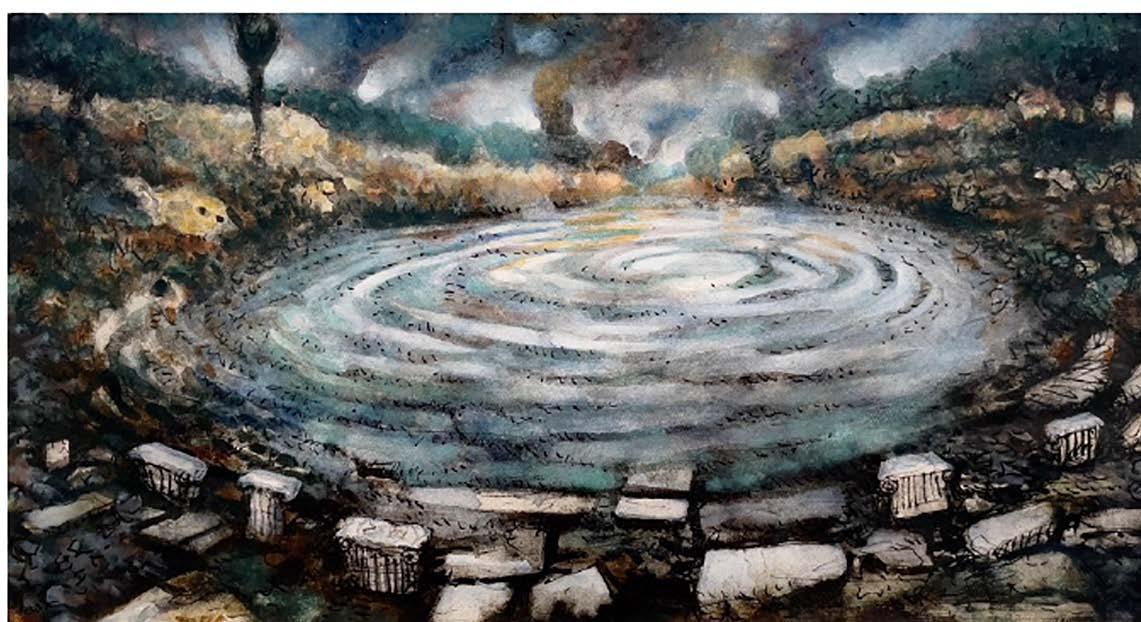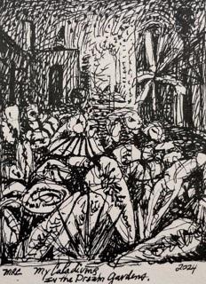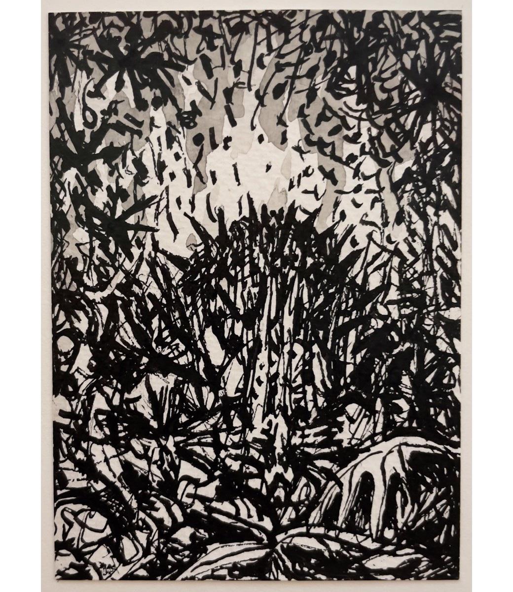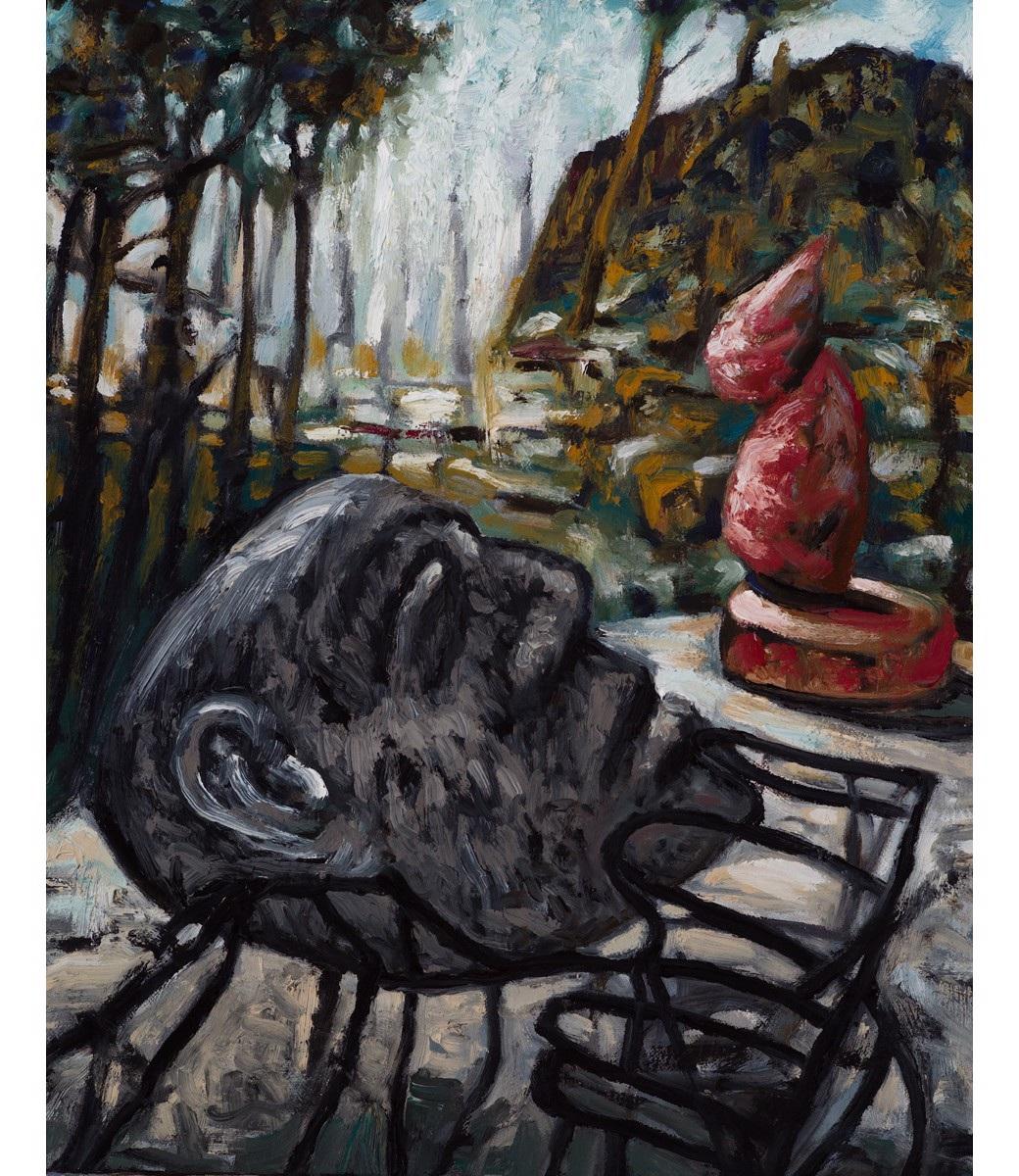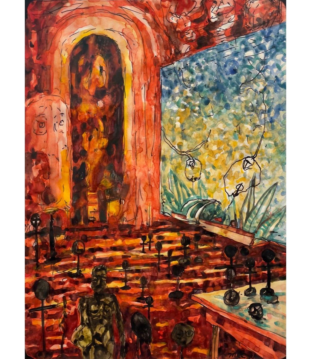 Floating between allegory and abstraction, Collins’ paintings are inhabited by the recurring forms of decaying architecture, coastal relics, ritual figures, and above all, gardens—lush and overgrown, often consuming what humanity leaves behind. In these gardens, nature is not passive, but a moral force, one that punishes hubris and restores balance. They are spaces of reckoning and regeneration.