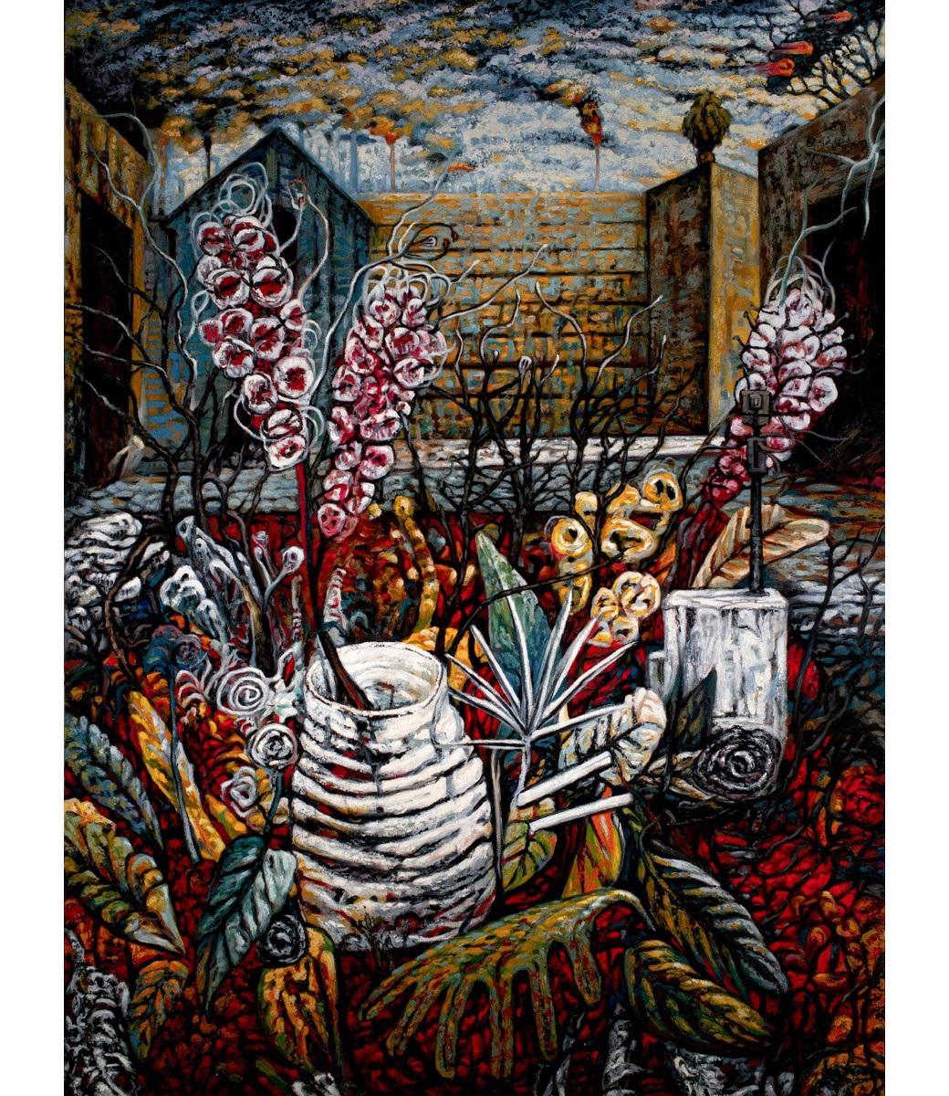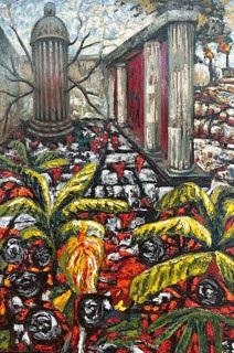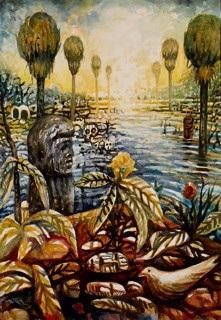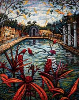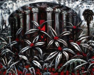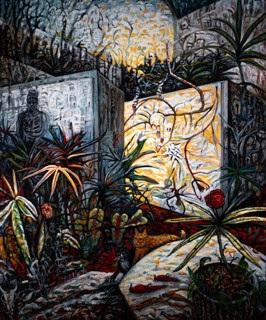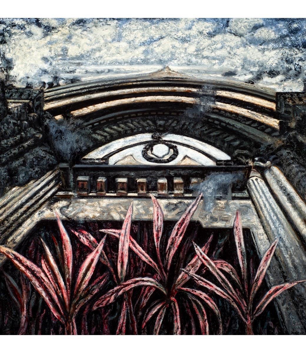 In many recent series the garden spaces contain verdant vegetation, which erupts with life amidst abandoned factories, decaying ancient roman buildings and other vestiges of a collapsed human presence. In my paintings nature becomes a punitive element. The architecture is being eviscerated by nature. The buildings are metaphors for our naiveté in believing that nature may be controlled and that it is somehow independent to what humankind inflicts on the planet. Since childhood, I continue to be influenced by my native coastal surroundings, characterized by subtropical vegetation and sweltering, humid atmosphere and symbolic references to water. I imbue these and other elements drawn from my personal experience into a mystical artistic vision articulating the human condition which I feelpossessesacertainterriblebeauty.