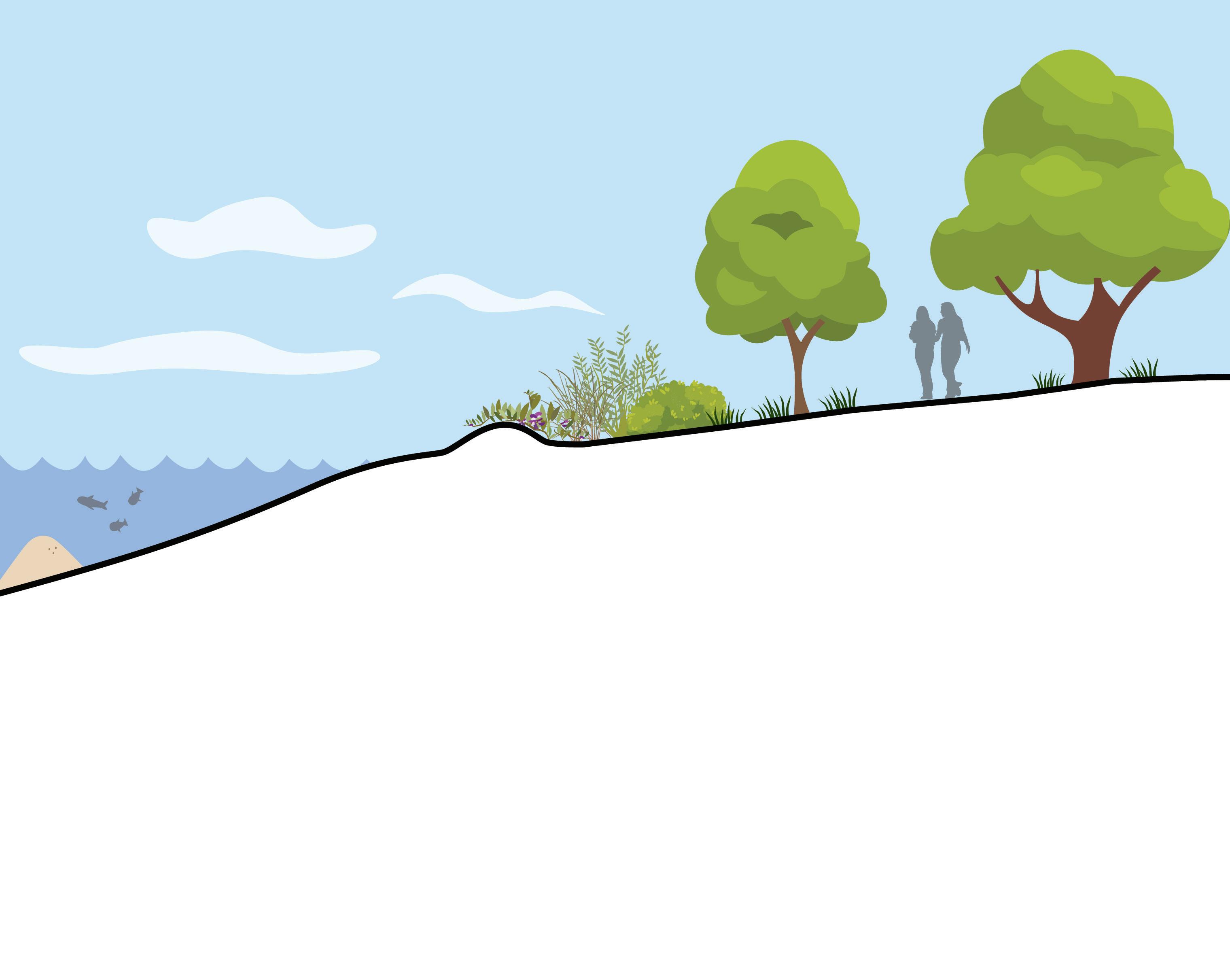 There are several opportunities to naturalize the shorelines within the project area. Below we present three habitat configurations that could be incorporated into the concept plans, depending on the location, and intended community use at each location. Two of the three configurations would result in a natural transition between habitat types without hard infrastructure along the waters edge, with the intention of improving the ecological function and ecosystem services within the project area while also enhancing the recreational experience for the community. The last configuration includes a riprap revetment to protect restored natural habitats behind it from strong wind and wave energy