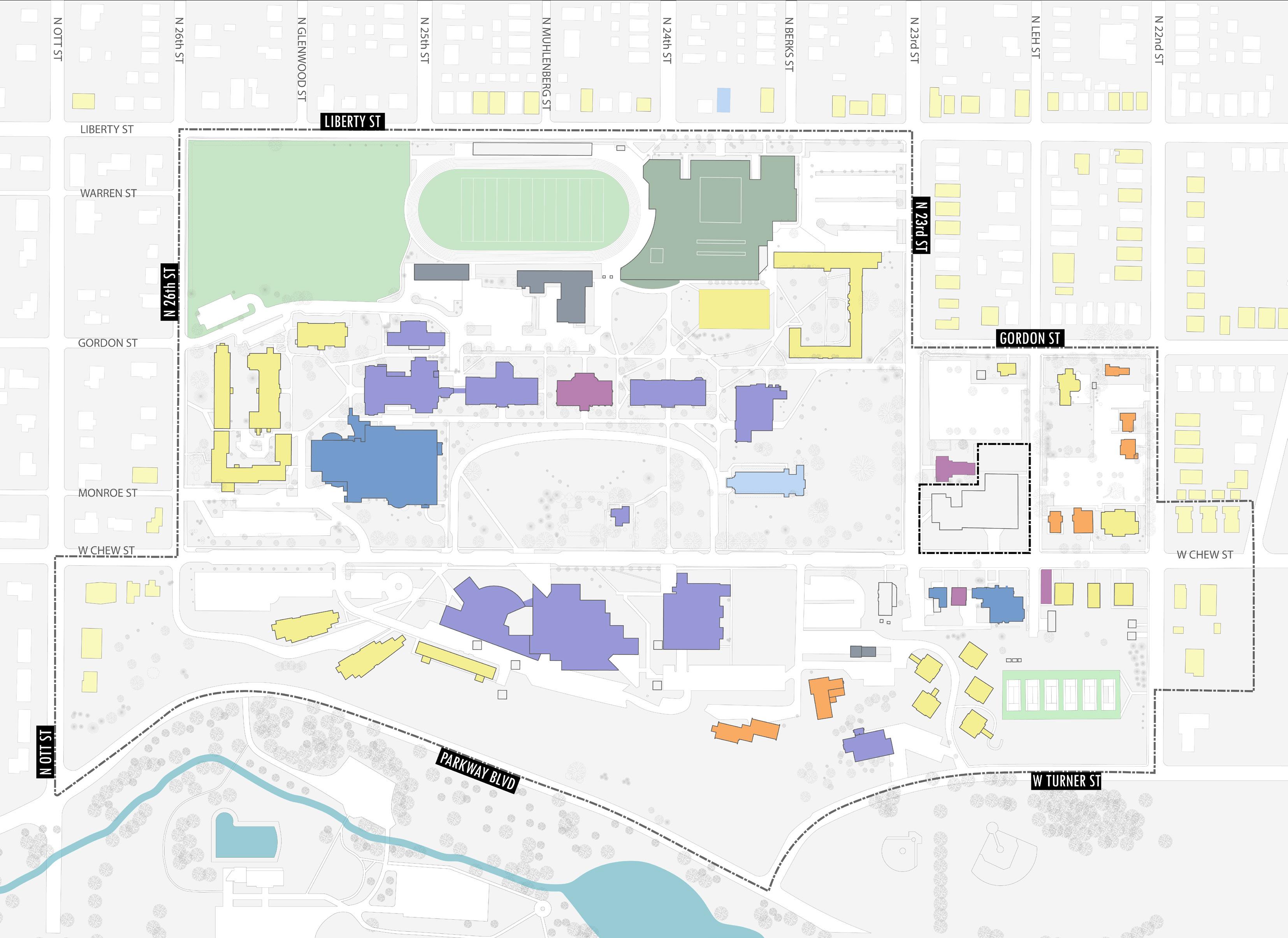 • A new parking garage replacing faculty and staff parking behind Academic Row, a new garage east of Trexler Library, and a surface parking lot at North 22nd and Turner Streets.