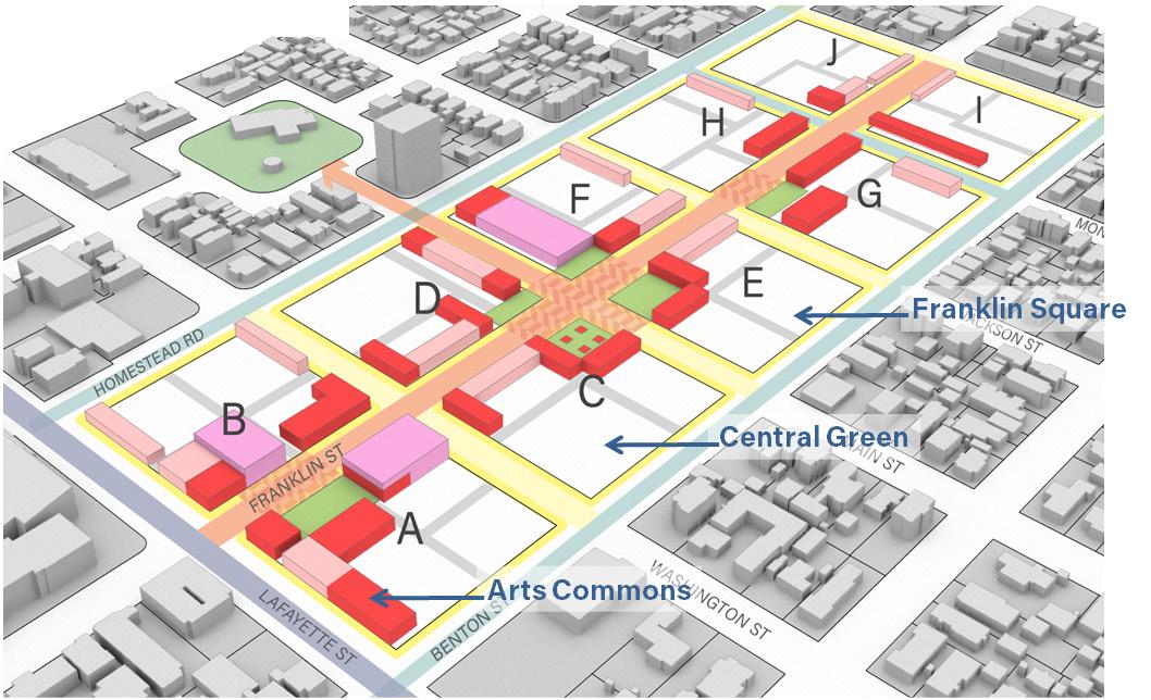 This Report recommends that the City apply for grants available through the state to help defray the cost of any new construction. Of special note, the Federal Transit Administration’s “Transportation Infrastructure and Innovation Act” (TIFIA) program offers Federal credit assistance for qualifying transit-oriented development projects, in the form of direct loans, loan guarantees, and standby lines of credit. Eligible projects must be within one-half mile radius of federally-regulated railroad or intercity bus service. Block D is entirely within one-half mile of intercity bus stops along El