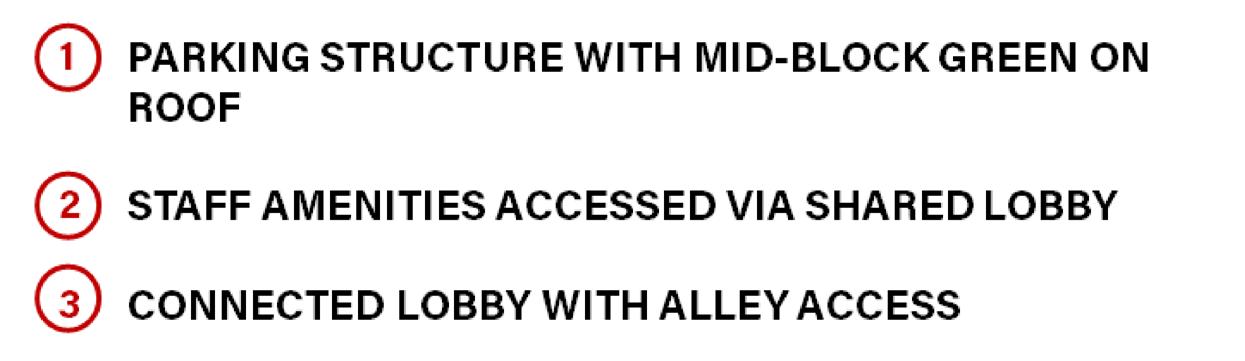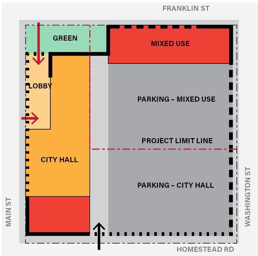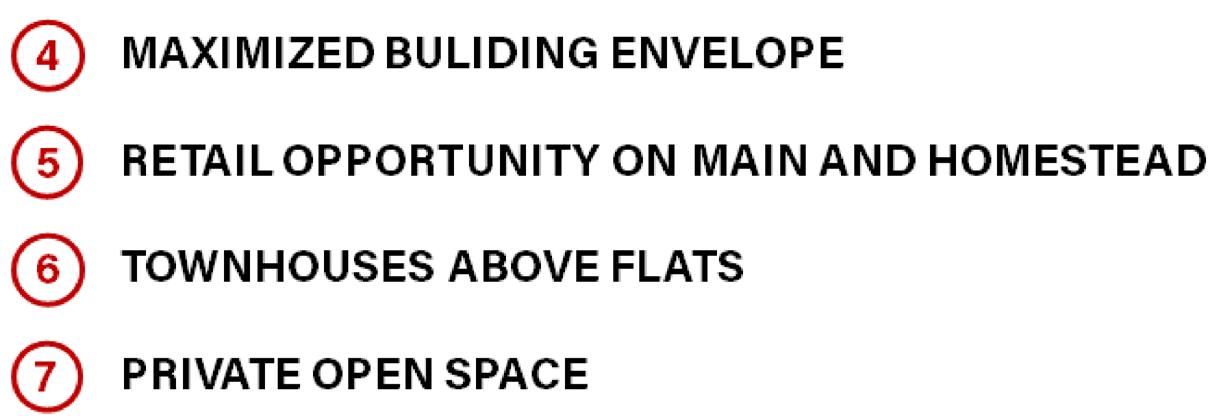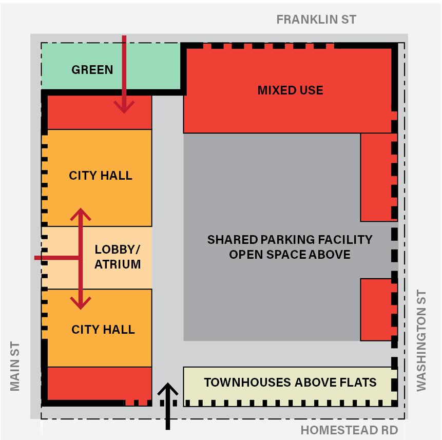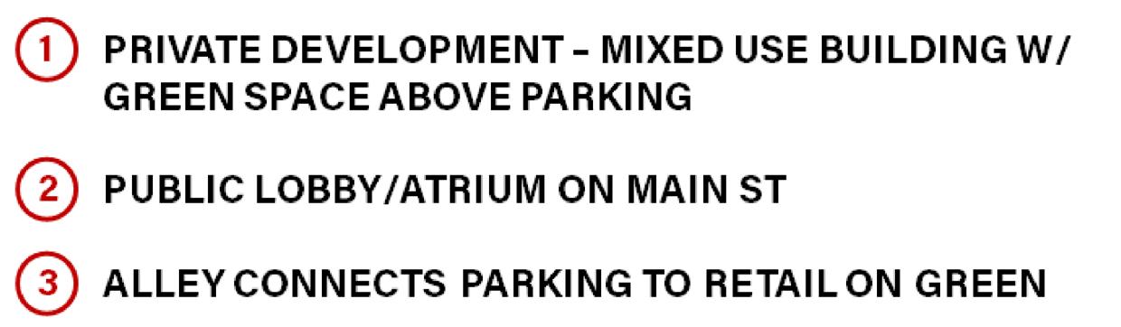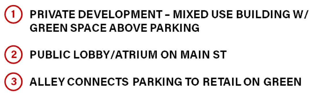 site. This design orients activity around the Central Green with commercial amenities along an arcade on the Green, and orients the lobby towards Main Street and its connection to Civic Plaza Park. Locating parking primarily below grade yields more buildable area on the street frontages, allowing for commercial spaces and additional housing units along all sides of the block.