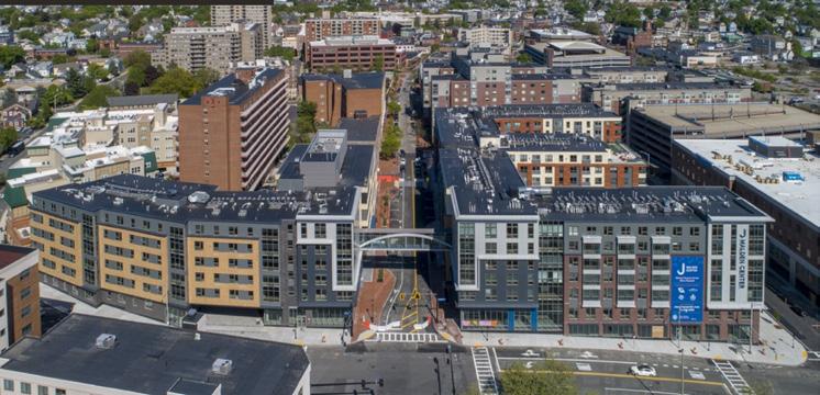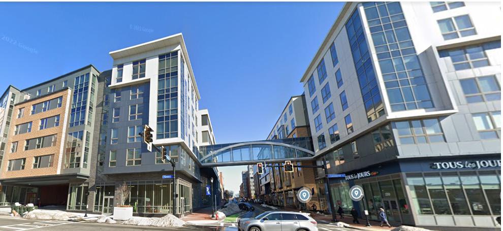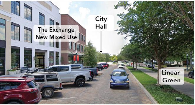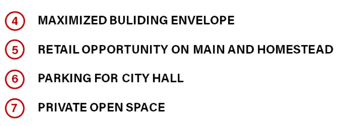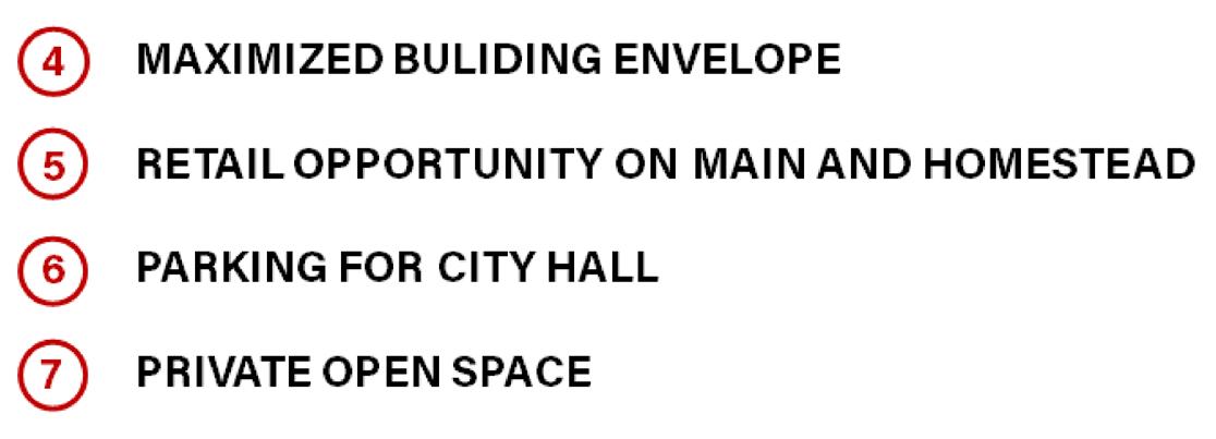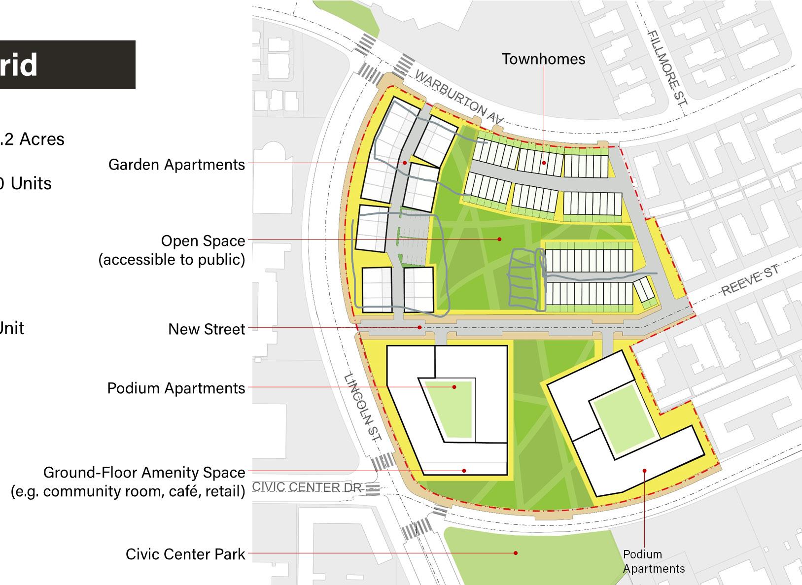 site. This design orients activity around the Central Green with commercial amenities along an arcade on the Green, and orients the lobby towards Main Street and its connection to Civic Plaza Park. Locating parking primarily below grade yields more buildable area on the street frontages, allowing for commercial spaces and additional housing units along all sides of the block.