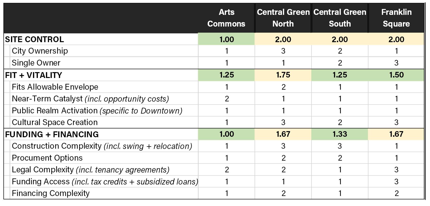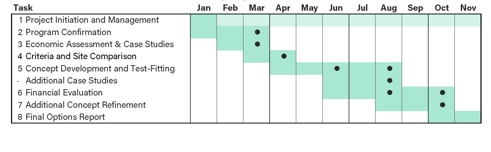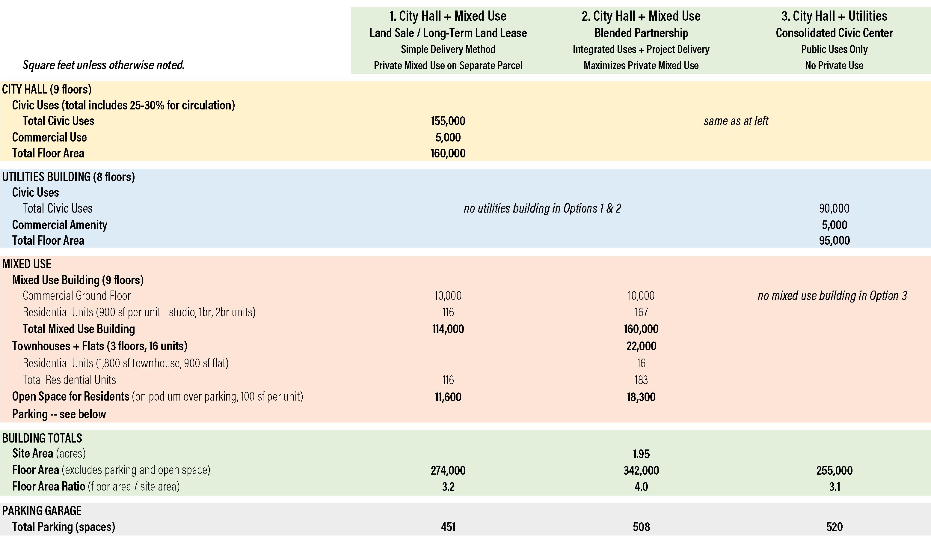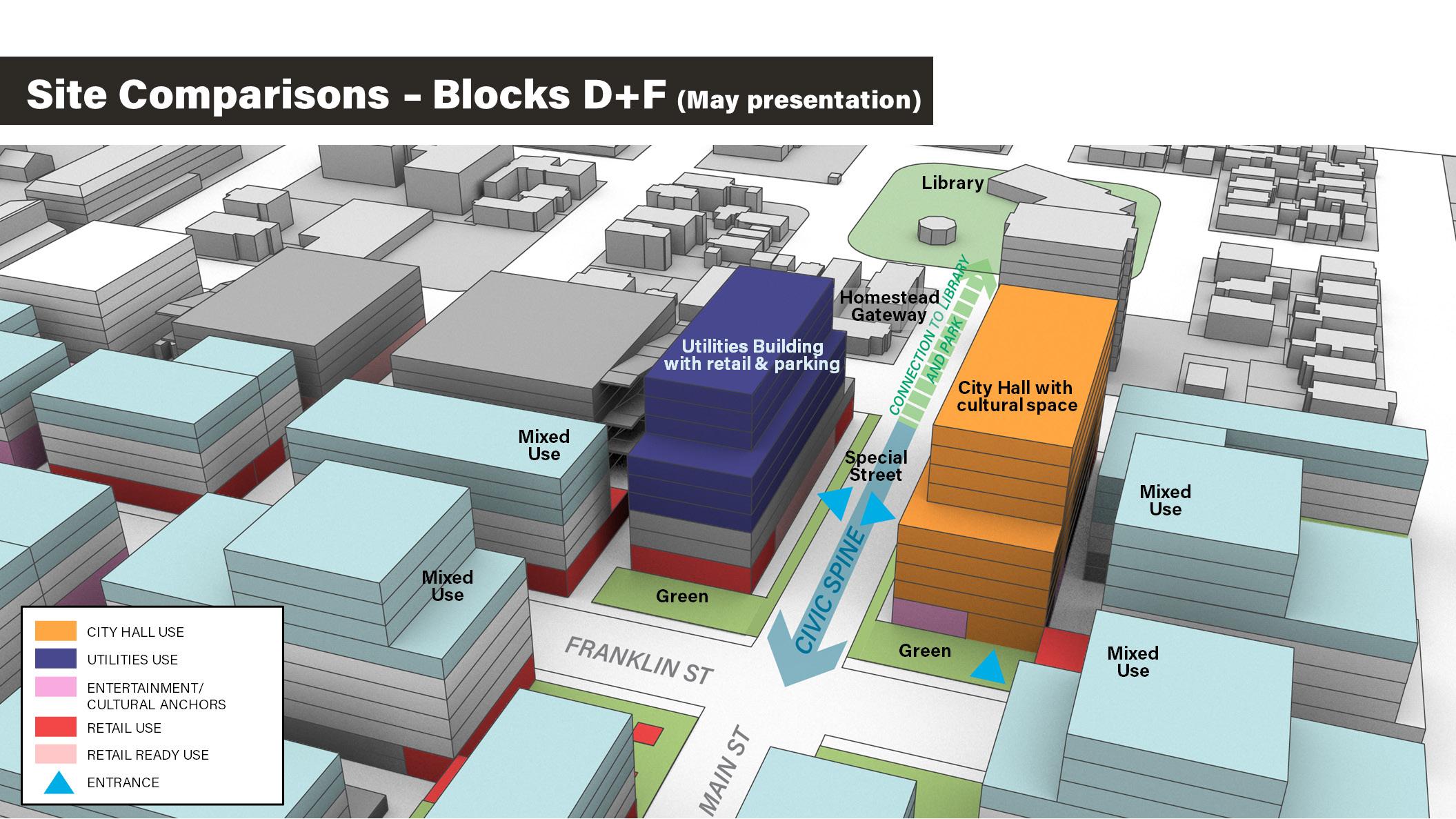 Options – examination of three different program, design, and project delivery options on a site preferred by the Downtown Community Task Force (DCTF);