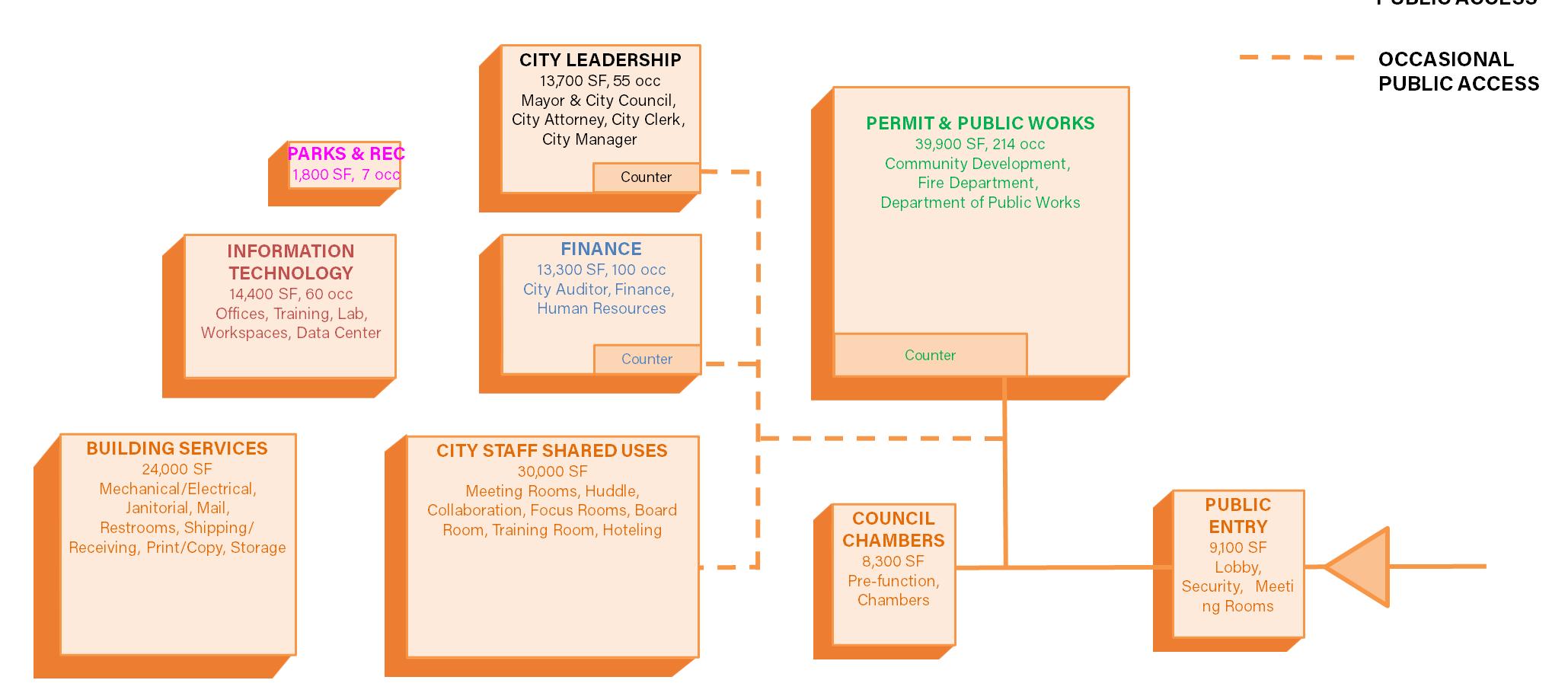 While the civic center program recommended by Smith Group was completed in early 2020, changes have since occurred that could justify a smaller City Hall than was assumed. The COVID pandemic saw an enormous increase in remote work among office workers. While many employers are requiring that employees work in a common office on more days of the week, there appears to be a lasting trend towards some share of workers working remotely at least part of the time. An in-depth reassessment of City functions needs was not performed as part of this Study, and changes might have occurred, such as how community services are delivered and department staffing levels. Further analysis is needed by the City to determine what the appropriate mix of