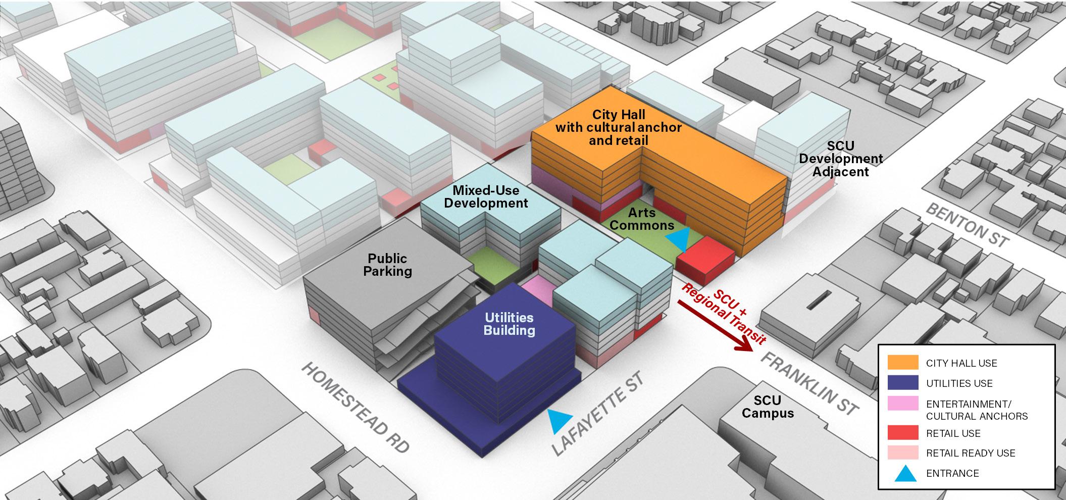 The City should continue its tradition of effective outreach and engagement. The DCTF and community input should continue to inform decision making, and cultivate an inclusive sense of shared purpose. The full value of a City Hall project could be more fully realized by engaging economists, financial institutions, Santa Clara University, and local property interests. Continued coordination among City departments and other government agencies could anticipate and help overcome potential obstacles to realizing an aspirational project. Finally, an even more aspirational