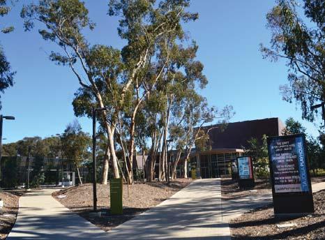 At the southern terminus of Ridge Walk, accessed off of North Torrey Pines Road, the Theatre District provides a unique opportunity for UCSD to interact with the public and surrounding community. Home to a cluster of buildings that serve both the La Jolla Playhouse and UC San Diego Department of Theatre and Dance, the area serves as a community interface for UC San Diego. Set in the historic Eucalyptus Groves, the landscape provides con nuity and a strong sense of place. This is a major point of entry for the campus primarily for pedestrians and cyclists entering the campus from neighboring communi es to the south. In addi on to performance art, the Theatre District is also home to three significant public art installa ons that are part of the interna onally renowned Stuart Collec on. Current plans include a stormwater project will address the site south of Revelle College Drive. that will showcase the University’s commitment to sustainable and resilient landscape design.