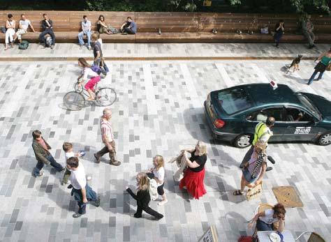 Complex to the west is not a center of ac vity and is buffered by a planted slope. This topography extends across the Square as a cross slope making one side awkwardly higher than the other. The Asher art piece while significant for its historic reference is not well integrated into the Square’s func on. The space lacks sufficient sea ng, some site features are in disrepair, and the surrounding curb is le over from a me when vehicles dominated the space. Despite the lack of energy from surrounding buildings the Square, tables and chairs are well used and events are held that are well a ended.