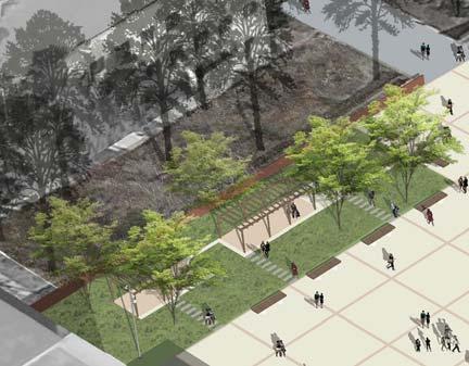 The area bordering the Student Services center will mimic the regular columns on the building with a regimented allée of trees and bench sea ng.