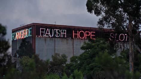 Nauman’s Vices and Virtues for the Stuart Collec on consists of seven pairs of words superimposed in blinking neon, which run like a frieze around the top of the Charles Lee Powell Structural Systems Laboratory. Seven vices alternate with seven virtues: FAITH/LUST, HOPE/ENVY, CHARITY/SLOTH, PRUDENCE/PRIDE, JUSTICE/AVARICE, TEMPERANCE/GLUTTONY, and FORTITUDE/ANGER.