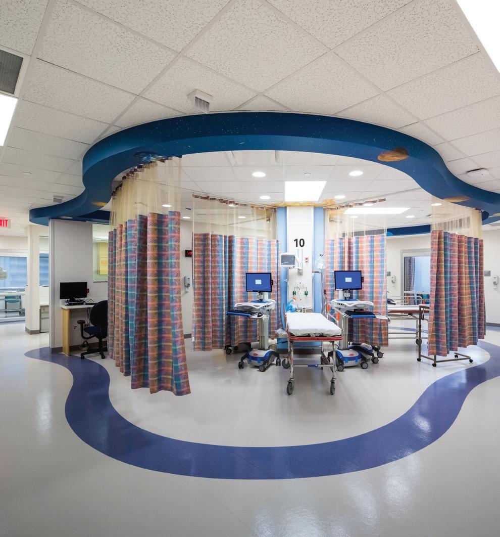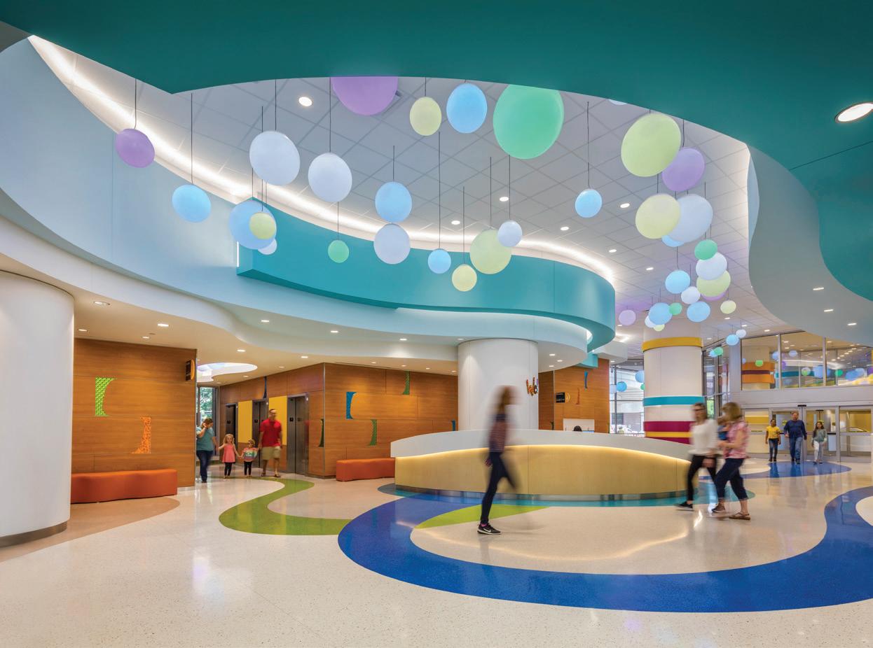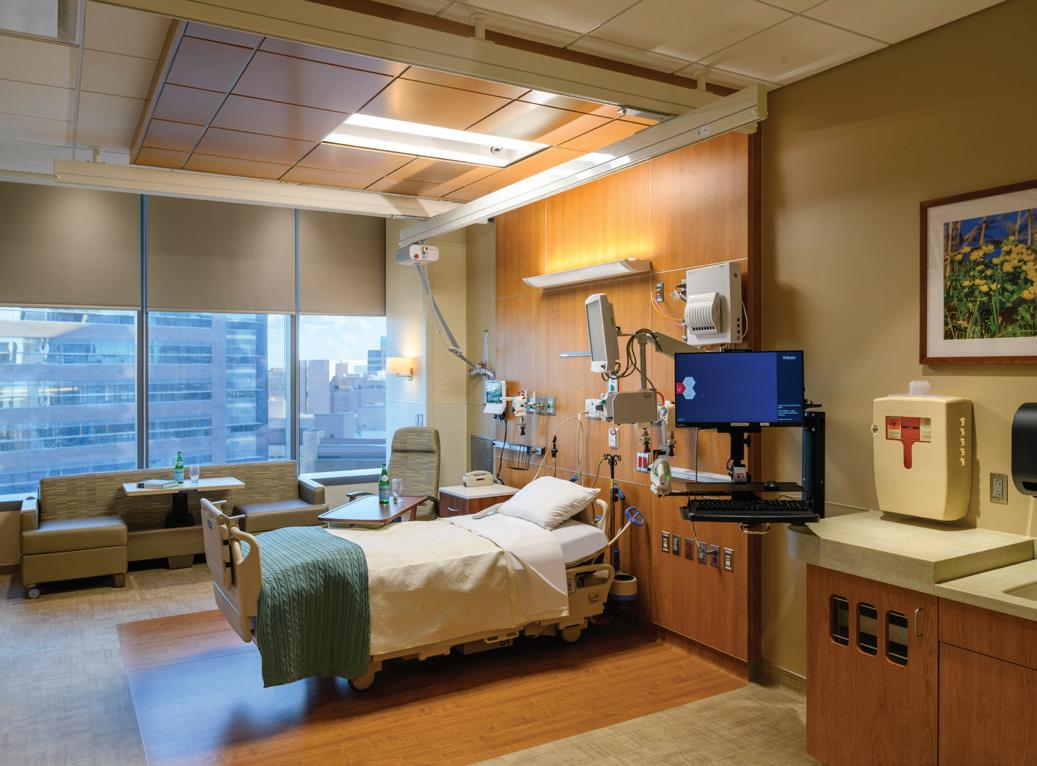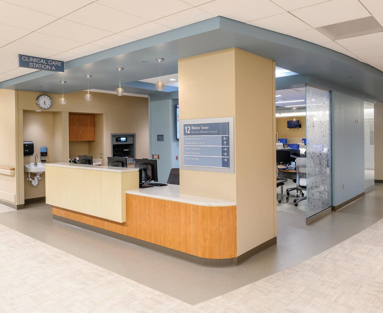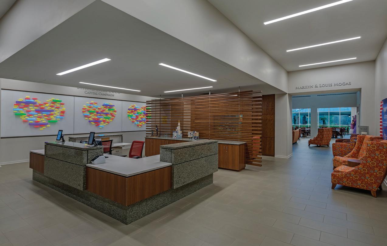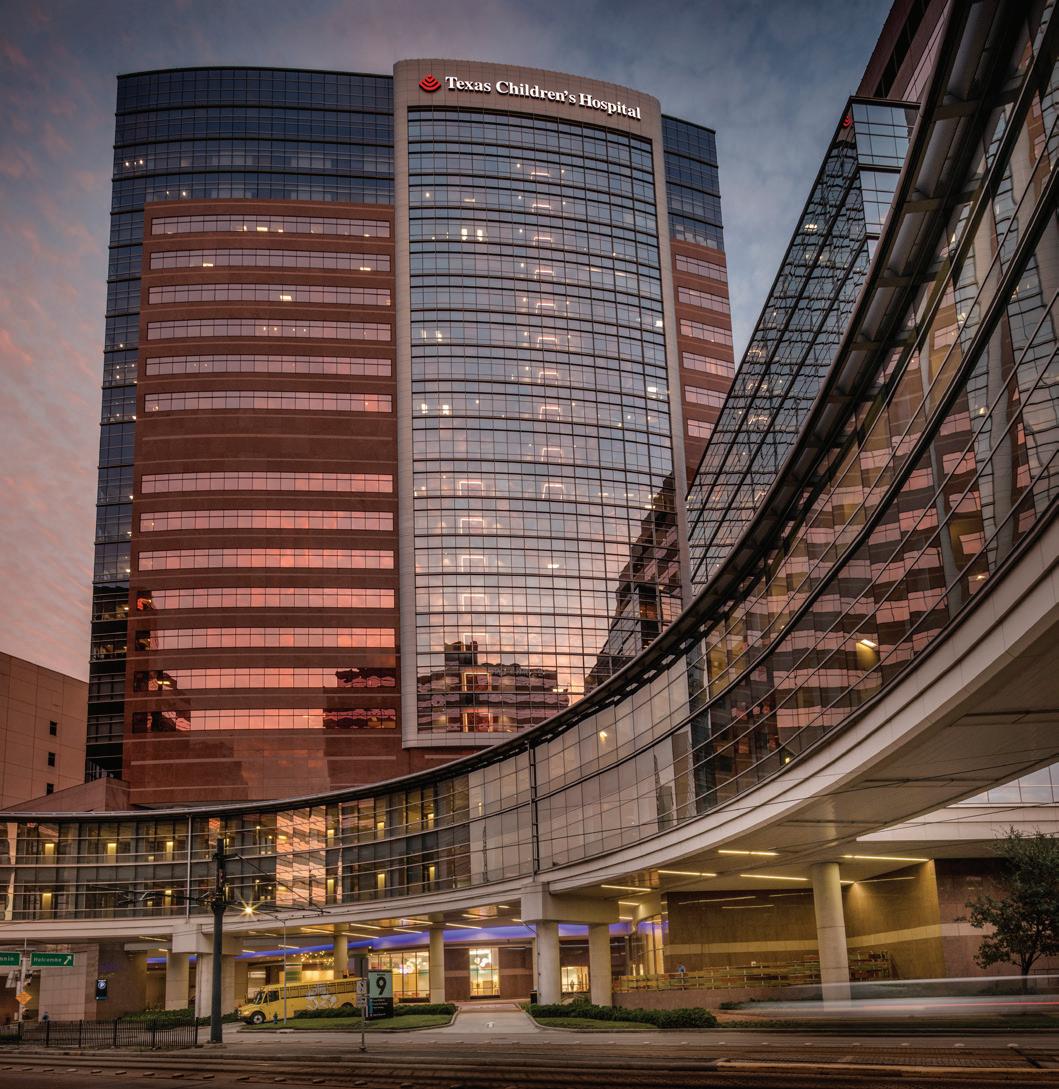 Soaring above the Texas Medical Center campus, the Lester and Sue Smith Legacy Tower, a 400-foot, 19-story vertical expansion, added 640,000 SF atop a fully occupied facility and boldly symbolizes the hospital’s mission to create a healthier future for children. Smith Legacy Tower, equipped with a roof-top helistop, houses new and expanded operating rooms, as well as new pediatric intensive care units (ICU) that span four floors with 84 beds, including dedicated neurological ICU rooms, surgical ICU rooms and a transitional ICU. Smith Legacy Tower is the new home of Texas Children’s Heart Center® – ranked #1 in the nation by U.S. News & World Report in cardiology and heart surgery. The Heart Center includes an outpatient clinic, four catheterization labs, cardiac intensive care units with 48 beds, four cardiovascular operating rooms with an interoperative MRI suite, and 42 cardiology acute care beds. Recognizing the importance of family as part of the healing process, the Smith Legacy Tower balances the need for privacy with critical patient care – expanding the size of the ICU rooms and equipping each patient room with family amenities.