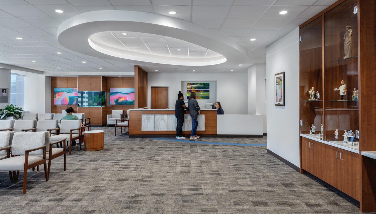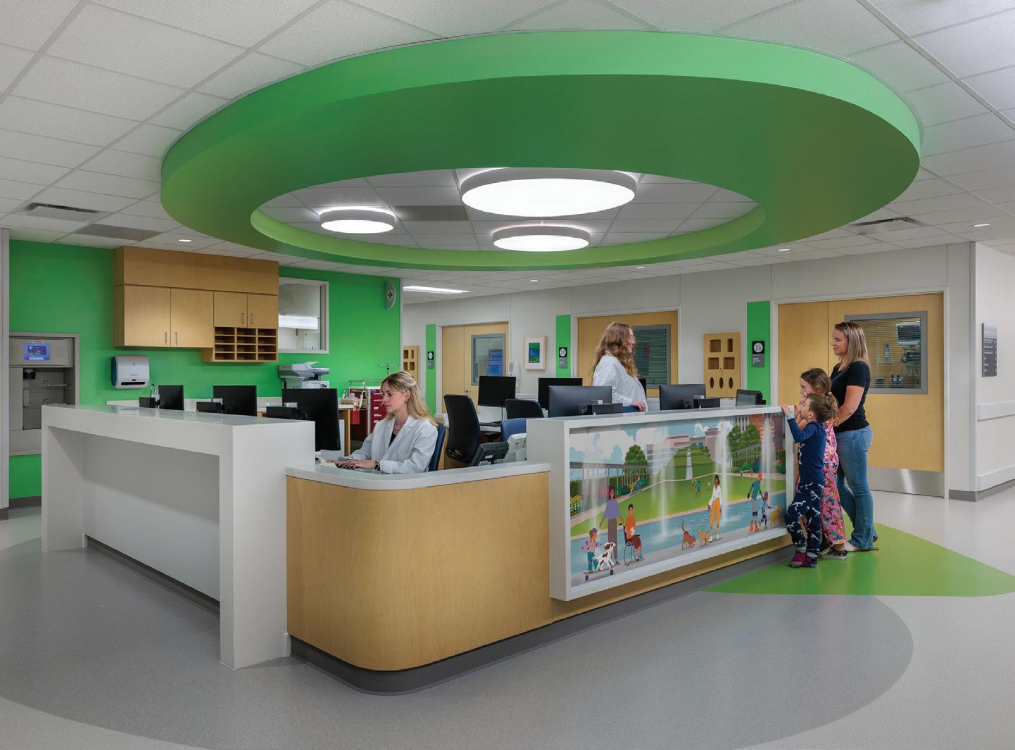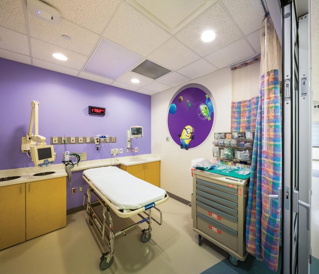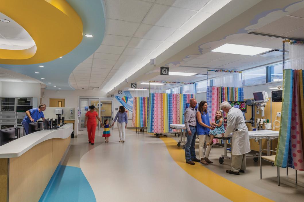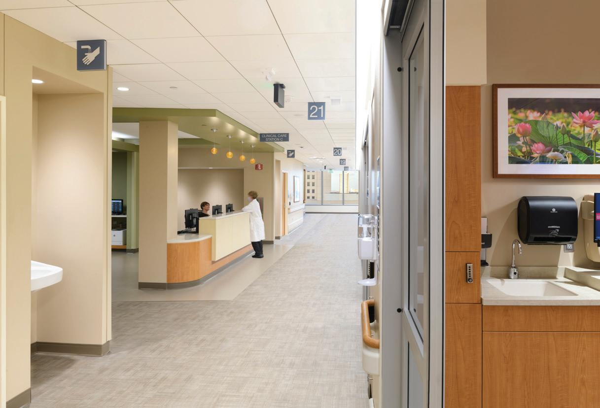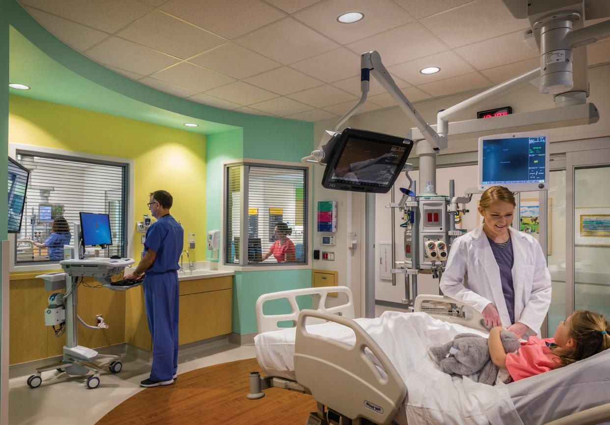 Soaring above the Texas Medical Center campus, the Lester and Sue Smith Legacy Tower, a 400-foot, 19-story vertical expansion, added 640,000 SF atop a fully occupied facility and boldly symbolizes the hospital’s mission to create a healthier future for children. Smith Legacy Tower, equipped with a roof-top helistop, houses new and expanded operating rooms, as well as new pediatric intensive care units (ICU) that span four floors with 84 beds, including dedicated neurological ICU rooms, surgical ICU rooms and a transitional ICU. Smith Legacy Tower is the new home of Texas Children’s Heart Center® – ranked #1 in the nation by U.S. News & World Report in cardiology and heart surgery. The Heart Center includes an outpatient clinic, four catheterization labs, cardiac intensive care units with 48 beds, four cardiovascular operating rooms with an interoperative MRI suite, and 42 cardiology acute care beds. Recognizing the importance of family as part of the healing process, the Smith Legacy Tower balances the need for privacy with critical patient care – expanding the size of the ICU rooms and equipping each patient room with family amenities.