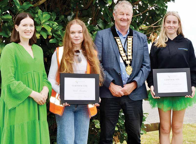 At the presentation of Crohn’s and Colitis New Zealand two ambassadors (from left) Brook van Velden, Nicole Thornton, Ashburton Mayor Neil Brown and the new youth ambassador Charlotte Livingstone. Photo: Supplied.