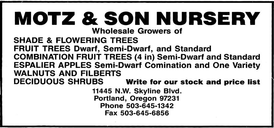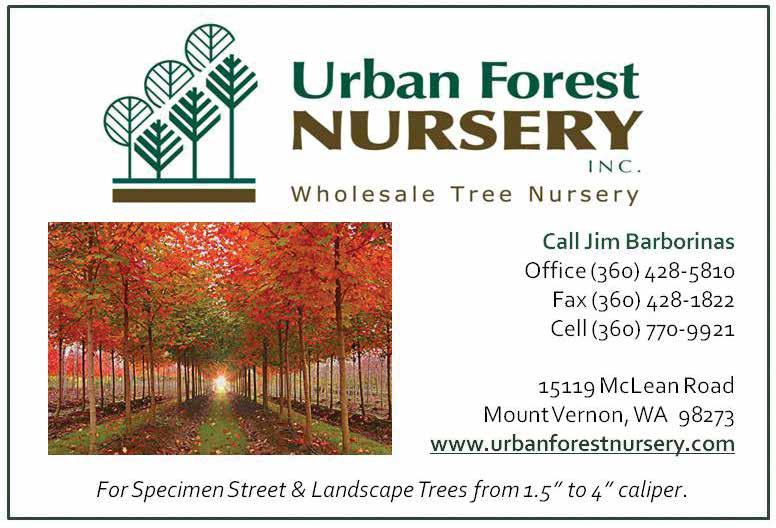 Specimen Street and landscape Trees in large Root Control Bags. Year around availability, easier shipping, handling and establishment. Mount Vernon. (360) 428-5810. Fax (360) 4281822. www.urbanforestnursery.com. WSNLA MEMBER.