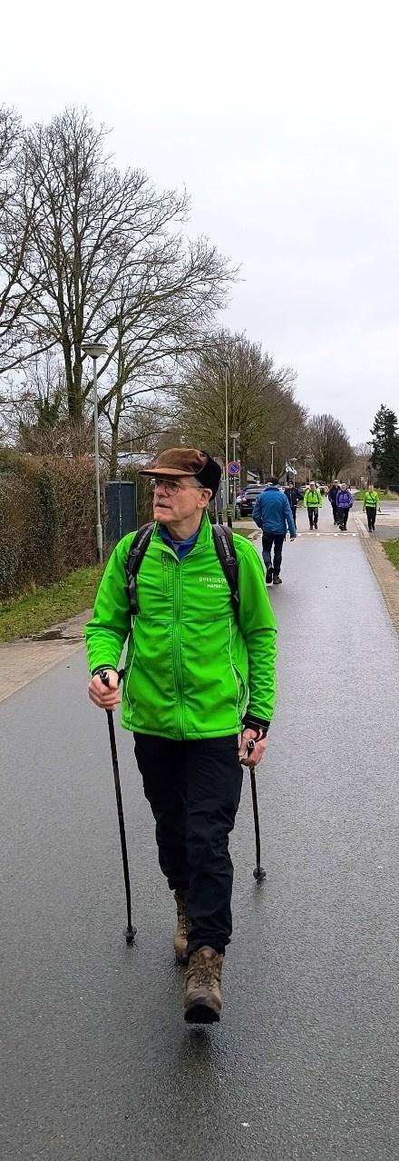 Het was een mooie en slim uitgezette tocht met ik dacht iets van vijf afstanden. De centrale pauzeplaats was in een boerenstal. Toen ik binnenkwam dacht ik dat dit ook de stallingsplaats van de kadi-wagen was maar dat was niet zo. Die was speciaal voor deze gelegenheid uit zijn echte stalling gehaald. Ontzettend gezellig ingericht! Voldoende zitplaatsen en ook hier werd lekkere koffie geschonken. Veel enthousiaste vrijwilligers om iedereen van een natje en een droogje te voorzien. Een aantal had ik lange tijd niet meer gezien. Ik heb ervan genoten! Hulde aan de boer die toestemming heeft gegeven om deze pauzeplaats mede mogelijk te maken. Na twee keer de pauzeplaats te hebben bezocht gingen wij weer richting finish. Wij hebben de zeventien gelopen, dacht ik. Een mooi begin van een nieuw wandelseizoen. Het mooie van gepensioneerd zijn is dat het wandelseizoen een stuk langer duurt dan wanneer je nog moet werken. Dat wandelen blijf ik het beste medicijn vinden. Zouden de doktoren moeten kunnen voorschrijven. Zouden we met z’n allen vaker moeten doen. Laten we nog meer mensen gaan motiveren om te gaan wandelen. Liefst in clubverband, liefst bij De Grenslopers!