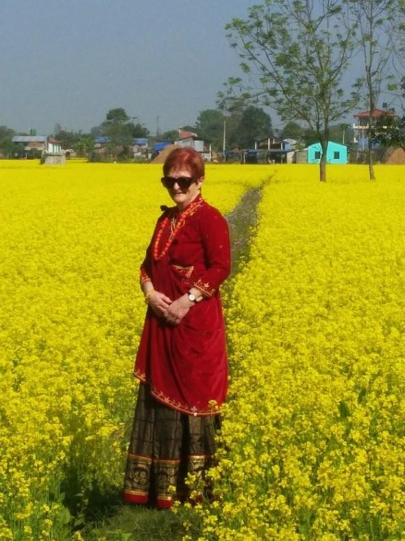 Thea vertelt nog heel enthousiast over Nepal. Hun beide schoondochters komen daar vandaan. Ze zijn er al verschillende keren geweest. Op de foto is Thea te zien in klederdracht van Nepal.