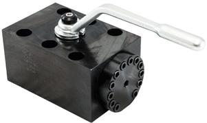 H L-O-X series hydraulic lockout valves for machine guarding applications block the flow of hydraulic fluid to stop cylinder motions. This valve safely bleeds pump flow and downstream pressure to tank through its own independent, full-flow exhaust lines. A manually operated handle can accept a lock or hasp to prevent the reapplication of pressure buildup. These valves are rated to 6,000 psi (414 bar) and are available in 1/2, 3/4, and 1-1/4 in. port sizes with flow rates of 20, 35, and 50 gpm, respectively. Each valve is made of carbon steel and includes Delrin and nitrile rubber (Buna-N) seals.