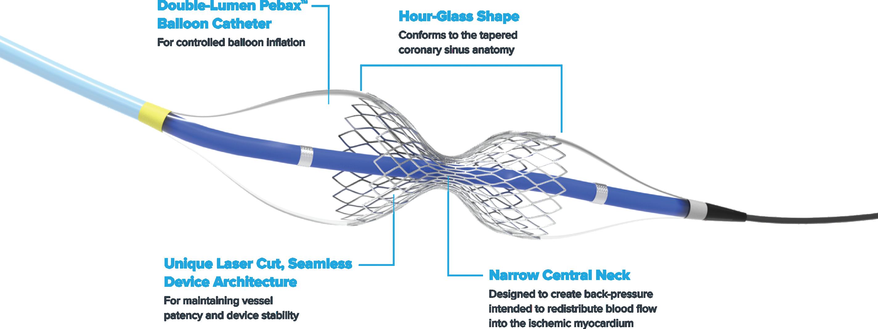 The device’s narrow central neck throttles the flow of blood through the coronary sinus, creating back-pressure. Shockwave says that pressure redistributes blood into a patient’s ischemic myocardium (heart muscle), relieving the symptoms of refractory angina.