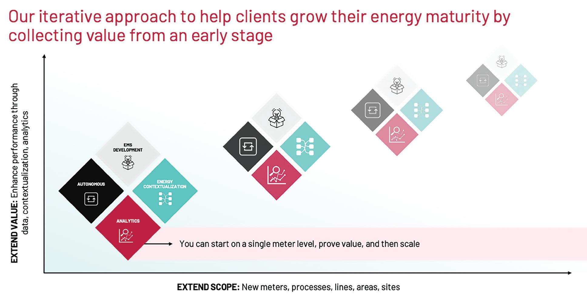 Companies can start on a single meter or at the equipment level, beginning with the most energy-intensive one onsite. By applying these concepts with a narrower scope, the value will be proved faster and the path to scale to new meters, equipment, lines and sites will be easier and simpler from a technological and business standpoint. PE