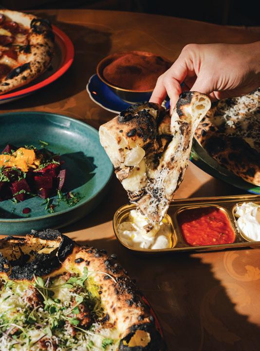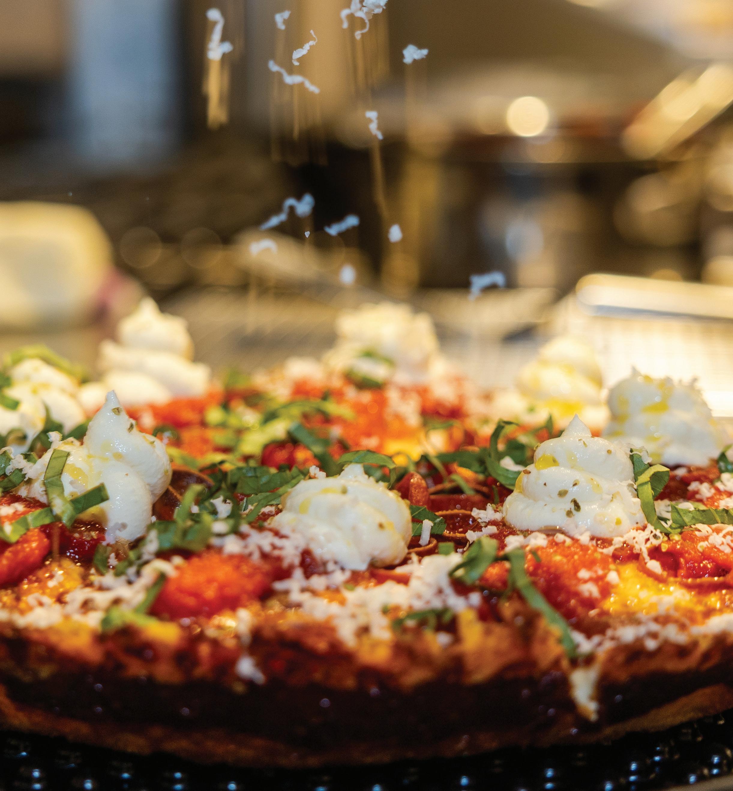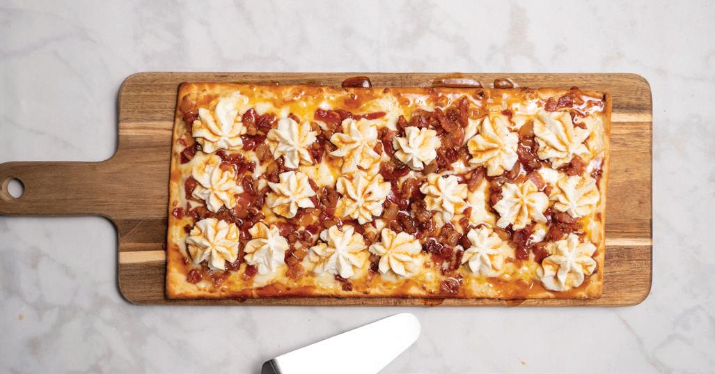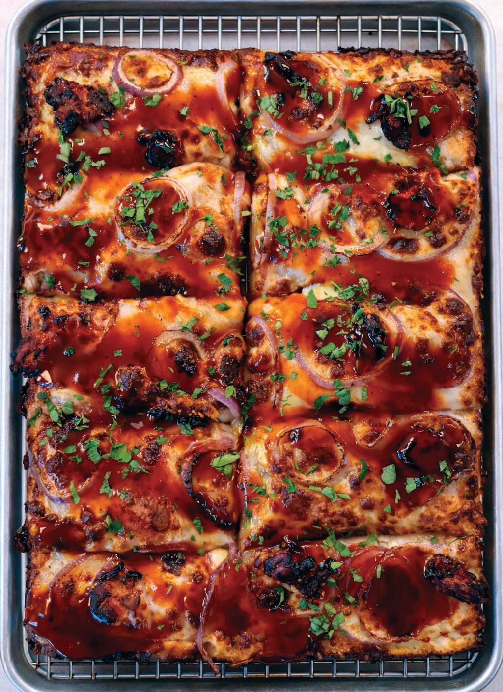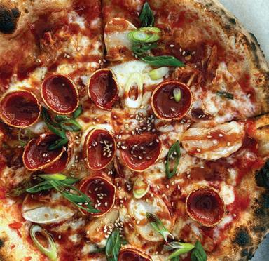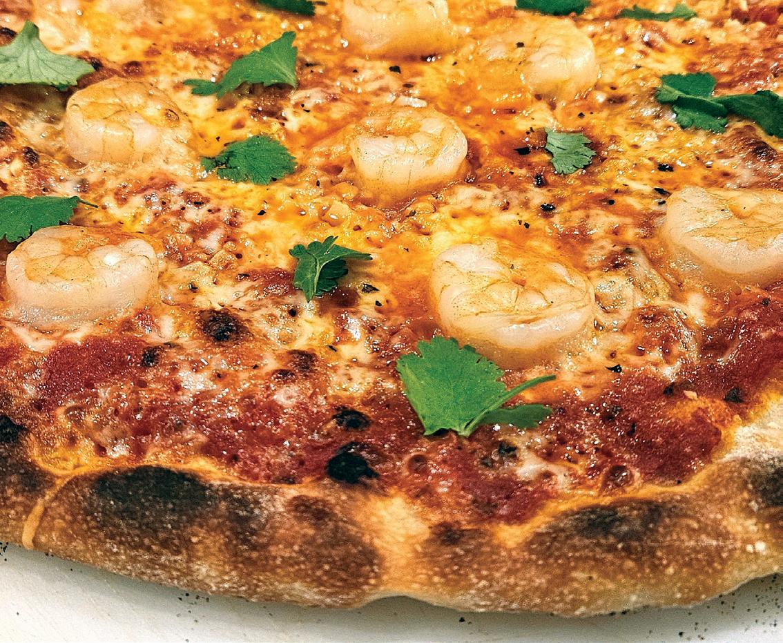 Parker’s cooking tips for this simple but flavorpacked pie: Since they’re 80% water, raw shrimp can make a swampy mess—par-cook them beforehand. And feel free to experiment with add-ons. “Raise the bar on this pizza even further with the addition of sliced alligator sausage,” Parker suggests. “Bacon and/ or sliced serrano chilis also work nicely. And, for the cilantro-averse, you can use fresh Italian parsley or chopped scallions instead.”