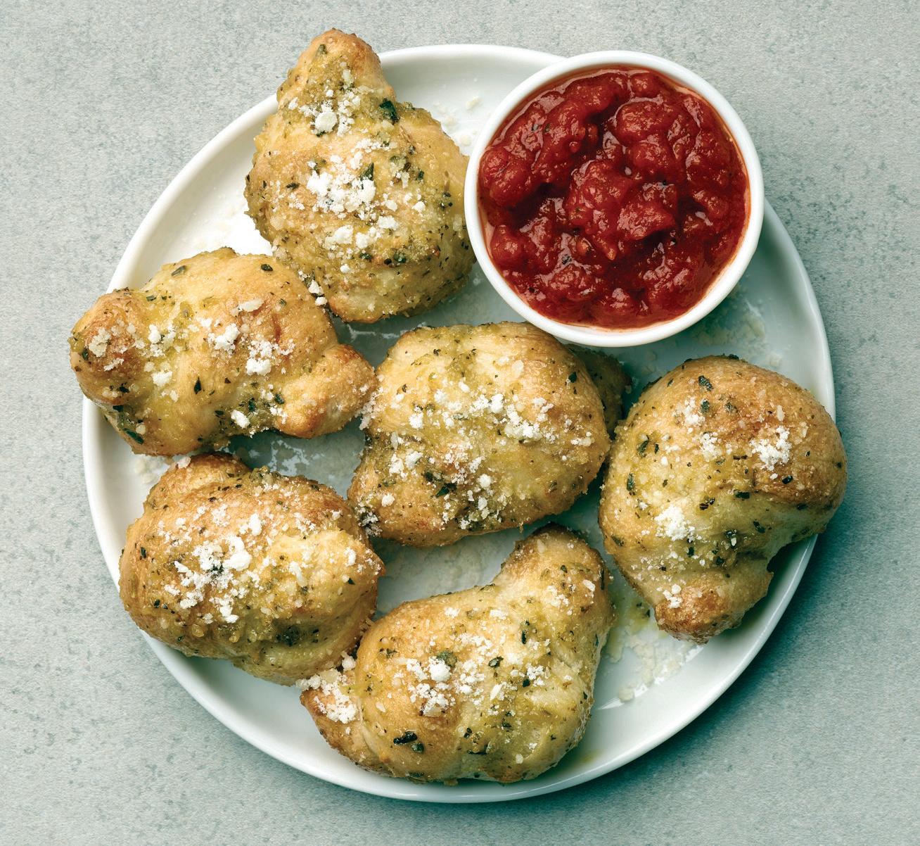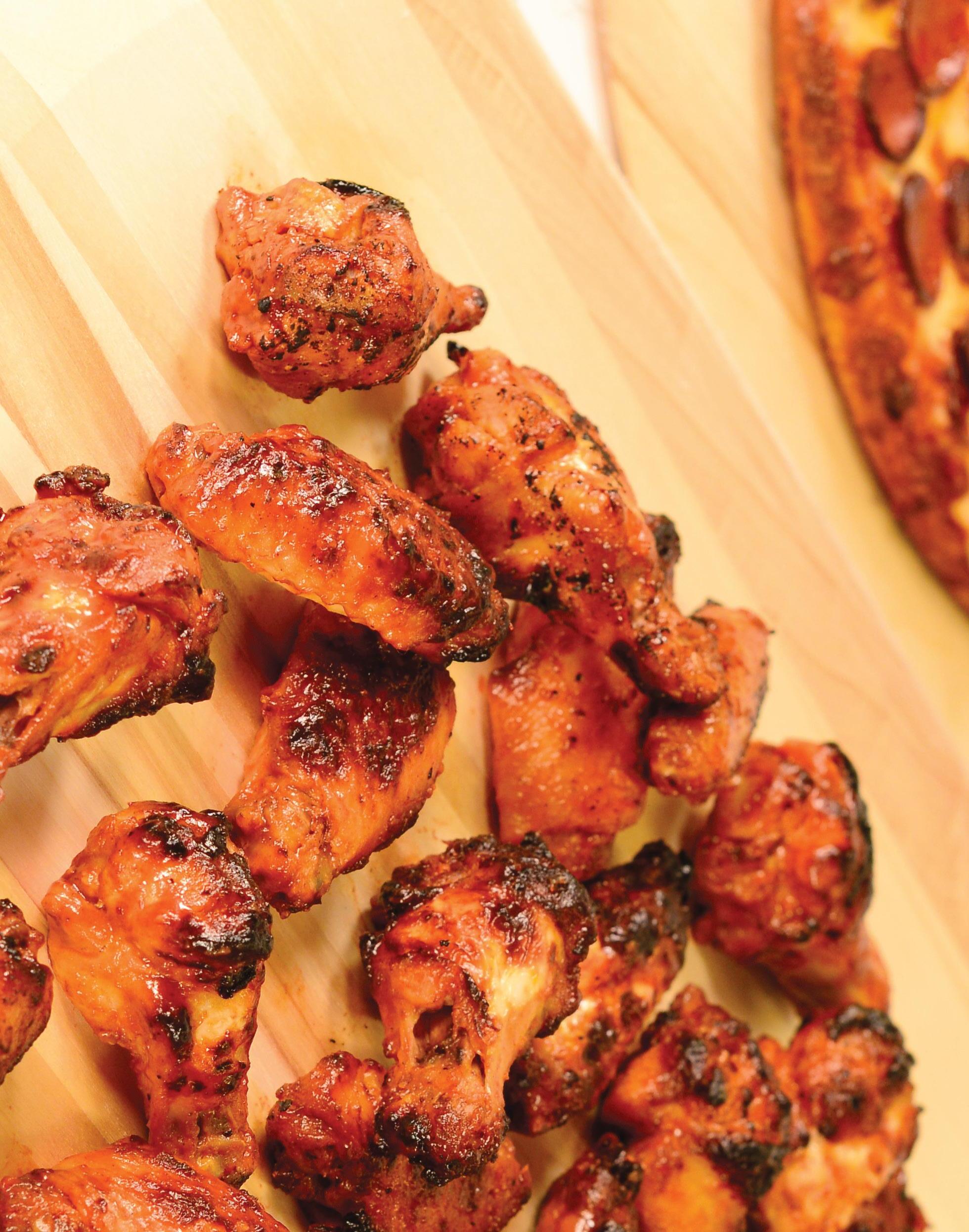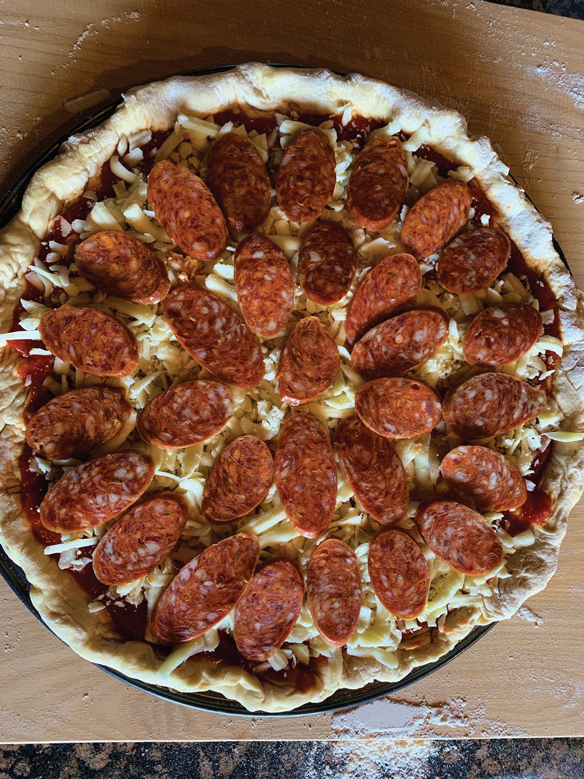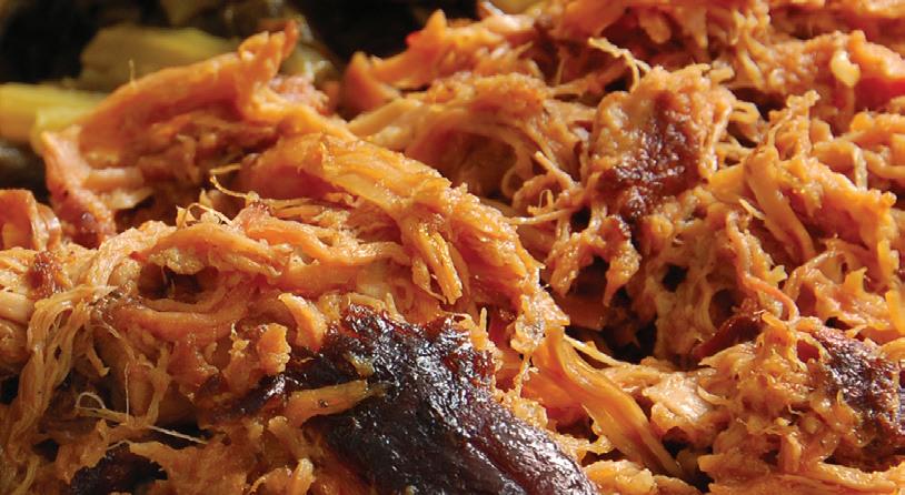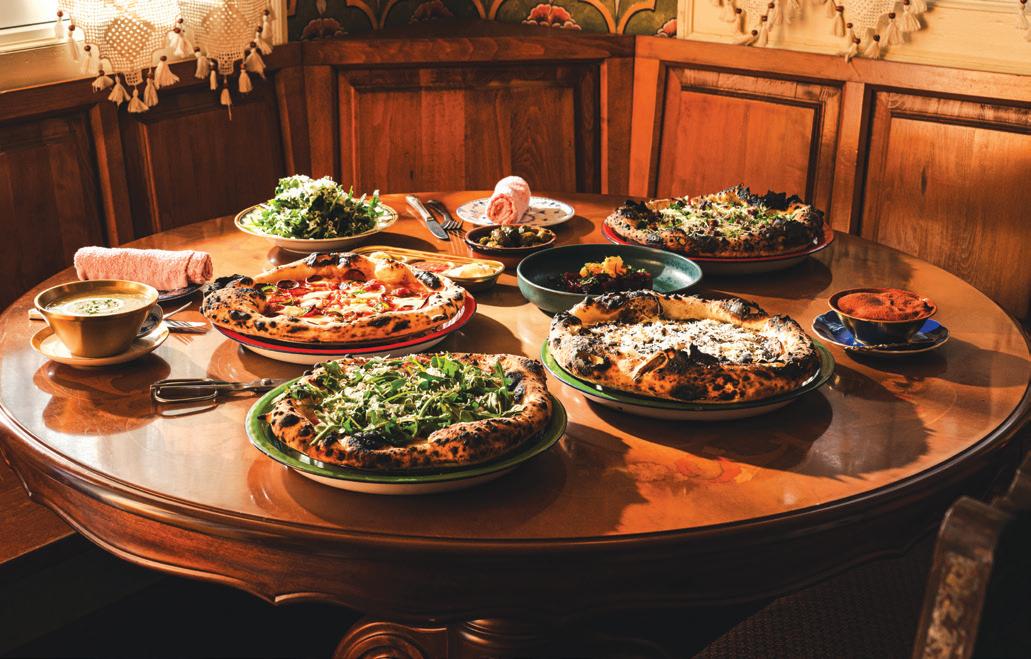 Parker’s cooking tips for this simple but flavorpacked pie: Since they’re 80% water, raw shrimp can make a swampy mess—par-cook them beforehand. And feel free to experiment with add-ons. “Raise the bar on this pizza even further with the addition of sliced alligator sausage,” Parker suggests. “Bacon and/ or sliced serrano chilis also work nicely. And, for the cilantro-averse, you can use fresh Italian parsley or chopped scallions instead.”