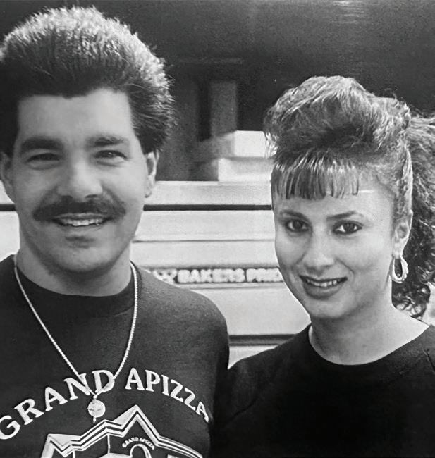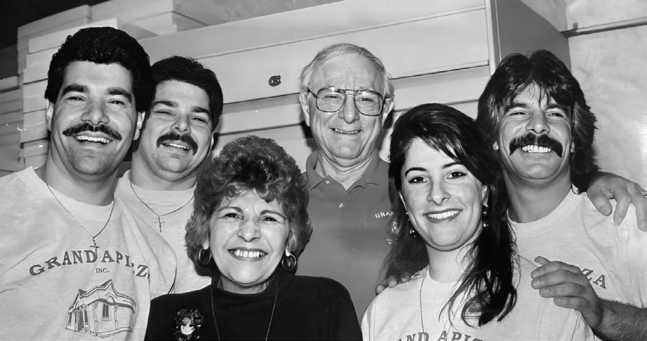 (Clockwise from top left) Fred Nuzzo, owner of Grand Apizza, poses with his brother, Nick Nuzzo, in 1970; the Nuzzo family (Michael Sr., Fred and Michael Jr.) show off a pie; Michael and Migdalia Nuzzo work at the shop in 1992; the Grand Apizza family includes Michael Jr., Migdalia, Mateo, Michael Sr., Daniella, Brittany, Marianne, Christopher and Luis; the Nuzzos (Michael, Rick, Rosemarie, Fred, Marianne and Dave) celebrate 40 years in 1995.