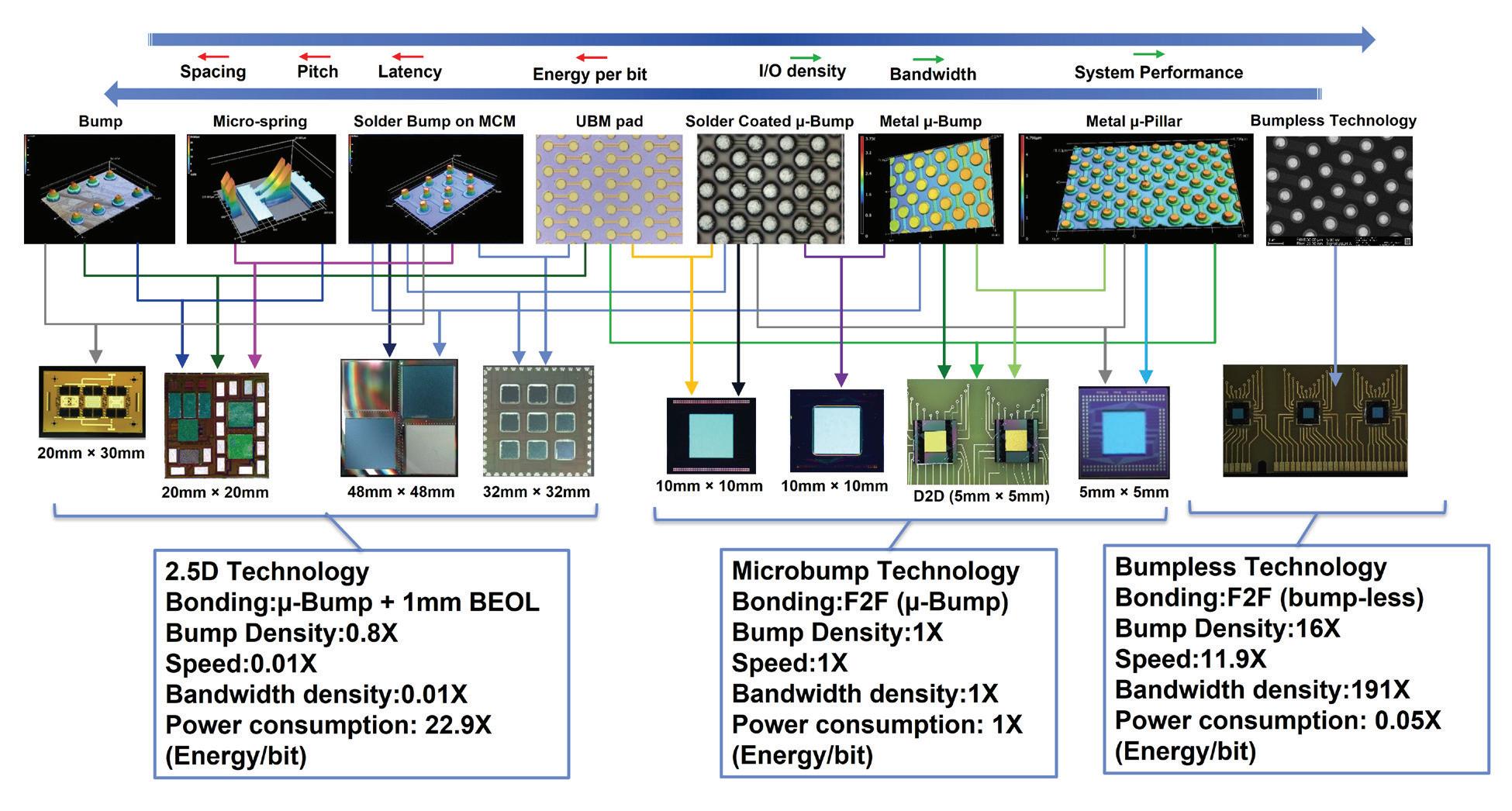 Figure 1 The diagram depicts a comparison of microbump to bumpless technology. uses an under-bump metal (UBM) pad for integration. The bumpless technology reduce pitch to increase input/output (I/O) density, increase bandwidth, reduce latency, reduce and increase overall system performance. The bumpless technology with AI optimized known good chiplets to make systems that perform like an extremely large single chip. uses a bumpless construction scheme with less than 1 µm communication distance pad pitch As shown in the figure, for 3D technology, the microbump (e.g., high-bandwidth scheme has a 20 40 µm communication distance and 30 µm bond pad pitch A 2.5 Xilinx FPGA) scheme has microbump +1mm BEOL communication distance and 30 The figure shows the advantages of bumpless technology over microbump-based technologies The bumpless technology's face-to-face(F2F) approach shows a possibility (speed = 1/total wire delay) and 191× bandwidth density (bandwidth density: bump improvement and 5% of the power consumption over the 3D microbump F2F approach. bumpless technology's F2F approach shows a possibility of 1190× speed (speed = 19100× bandwidth density (bandwidth density: bump density*speed) improvement power consumption over 2.5D technology approach.