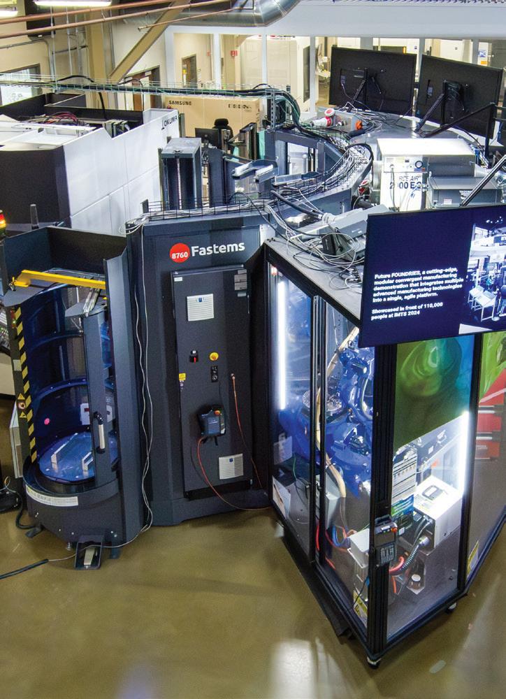 Future Foundries is a modular, convergent manufacturing platform that integrates disparate manufacturing technologies—additive manufacturing, CNC machining, and inspection—within a palletized, brand-agnostic framework. Its scalability enables seamless process transitions and easy integration of new and existing equipment, improving efficiency, reducing lead times, and enhancing agility for high-mix, low-volume production. This platform allows material to flow seamlessly from wire feed stock to finished part, complete with inspection via 3D scanning and heat treatment via induction heating. By merging additive and subtractive manufacturing with 3D scanning in an automated workflow, objects can be inspected and any detected anomalies repaired—all without human interaction. This process also streamlines repair operations by using subtractive to remove broken or damaged components, additive to add new material, and subtractive to finish the machine to desired tolerances, with 3D scanning for inspection after every step. Future Foundries achieves up to a 68% reduction in production time, especially for large metallic parts traditionally constrained by significant lead times and carbon footprints. The platform’s modular design and digital interface enable dynamic adaptation to changing manufacturing needs and easy integration with various OEM equipment, offering flexibility and lowering entry barriers for SMEs. Future Foundries streamlines production while democratizing advanced manufacturing technologies, making it a leader in sustainable industrial innovation.