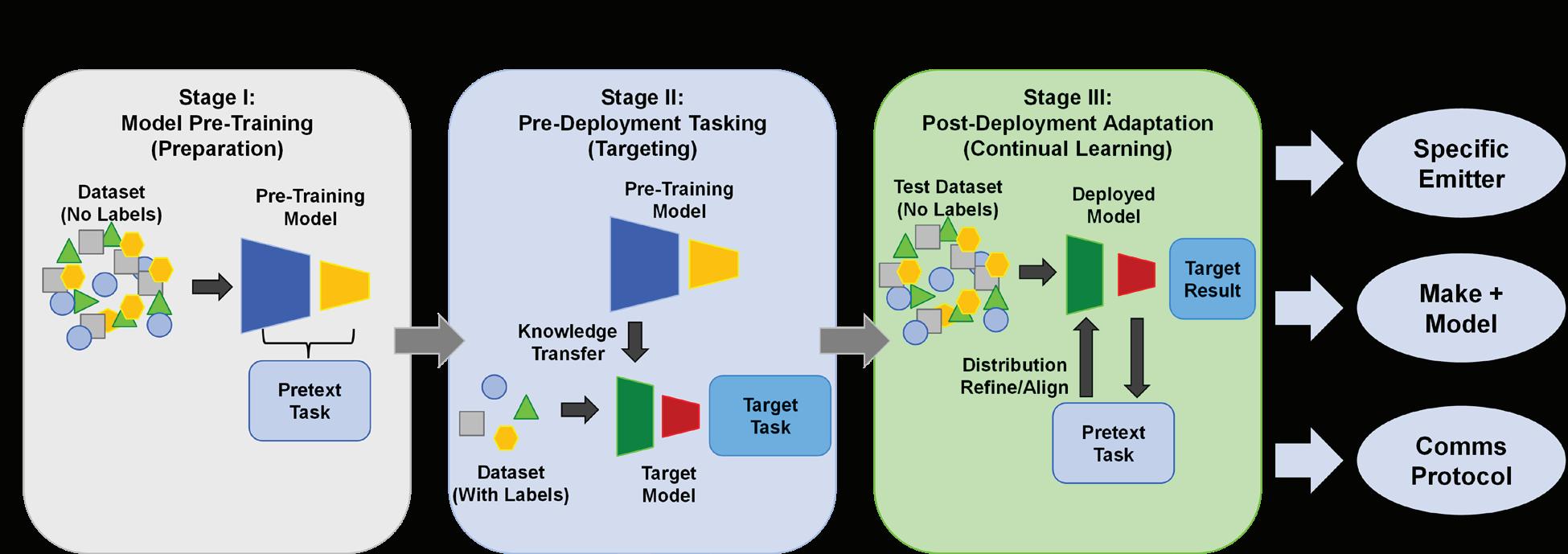 Figure 1: Shown here is the Lincoln Laboratory Radio Frequency Situational Awareness Model's (LL RF-SAM) three-stage workflow, which consists of model pre-training (Stage I) focused on solving a pretext task of pseudo-labeling that can be derived from the data itself without human expert labeling; pre-deployment tasking (Stage II) that consists of taking the features learned in Stage I and focusing on a new target task, such as classification of a specific emitter, make, and model of an emitter family or a specific communications protocol; and post-deployment adaptation (Stage III). In Stage I, the model learns from large volumes of unlabeled data, in Stage II those features are refined and then continuously adapted during deployment in Stage III. This workflow provides a robust feature learning pipeline from conception to deployment.