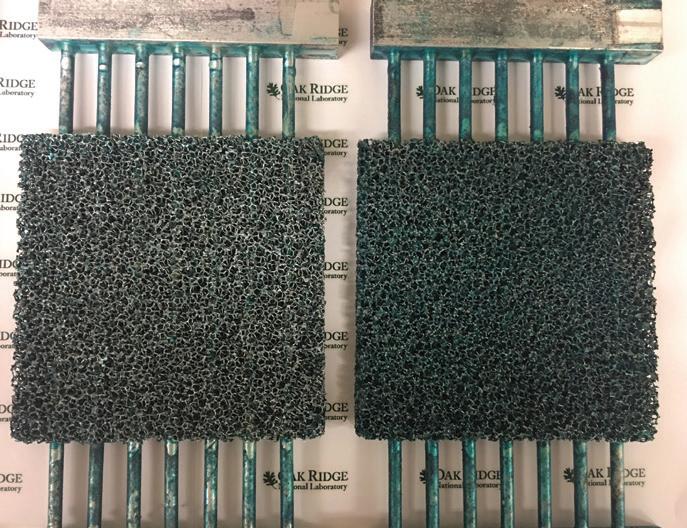 MF-SSLC (Metal-Foam–Based Separate Sensible and Latent Cooling) is a dehumidification platform that removes moisture using a thermally conductive porous metal-foam substrate coated with regenerable desiccants. It is used for humidity control and water management in air/ process streams, enabling separate treatment of latent and sensible loads. Effective humidity control is essential for maintaining indoor thermal comfort and preventing the negative health impacts associated with sick building syndrome. Conventional dehumidification systems typically rely on vapor compression cycles, which are often energy-intensive and bulky. In response to these limitations, ORNL has developed a groundbreaking metal foam-based Separated Sensible and Latent Cooling (MF-SSLC) system that decouples sensible and latent cooling processes. This innovative system leverages a unique porous metal foam substrate, coated with advanced desiccants formulated in-house through a water-based process. The result is a compact, efficient moisture management approach that significantly reduces the footprint of traditional systems while enhancing the overall system coefficient of performance (COP). By integrating high-performance desiccant materials with a highly porous and thermally conductive structure, ORNL’s MF-SSLC represents a major advancement in dehumidification technology. With broad potential applications across commercial and residential sectors, this scalable solution promises to redefine moisture control and support global efforts toward improved energy efficiency and sustainability.