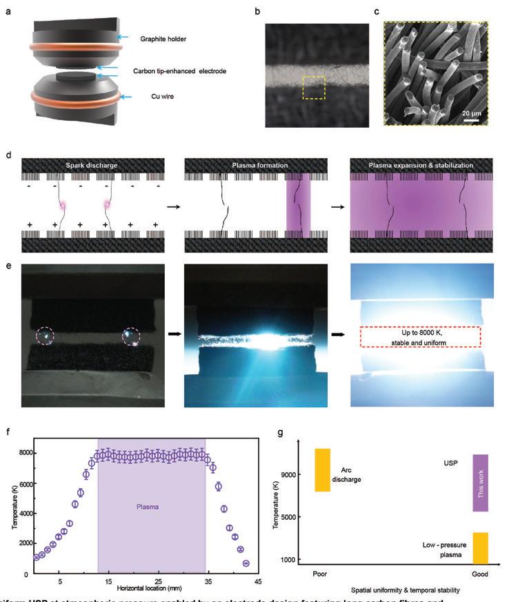 The team developed a uniform, ultrahightemperature, stable plasma (USP) apparatus using tip-enhanced carbon-felt electrodes (Patent: PCT/ US2023/034378). It generates large-volume, controllable plasma with temperatures up to 8,000 K, high spatial uniformity and temporal stability enabling rapid synthesis and surface modification of refractory alloys, advanced ceramics and composites in seconds. Because its USP product relies on radiative and tipmediated discharge from carbon-felt electrodes, high-temperature exposure in an oxidation environment may induce minor carbothermal reduction or carbon contamination of oxygen-sensitive materials. Nonetheless, the ultrashort dwell times (seconds) for rapid materials synthesis minimize these side reactions, and ongoing development aims to eliminate the potentially adverse carbon contamination and to extend uniform heating to larger volumes.