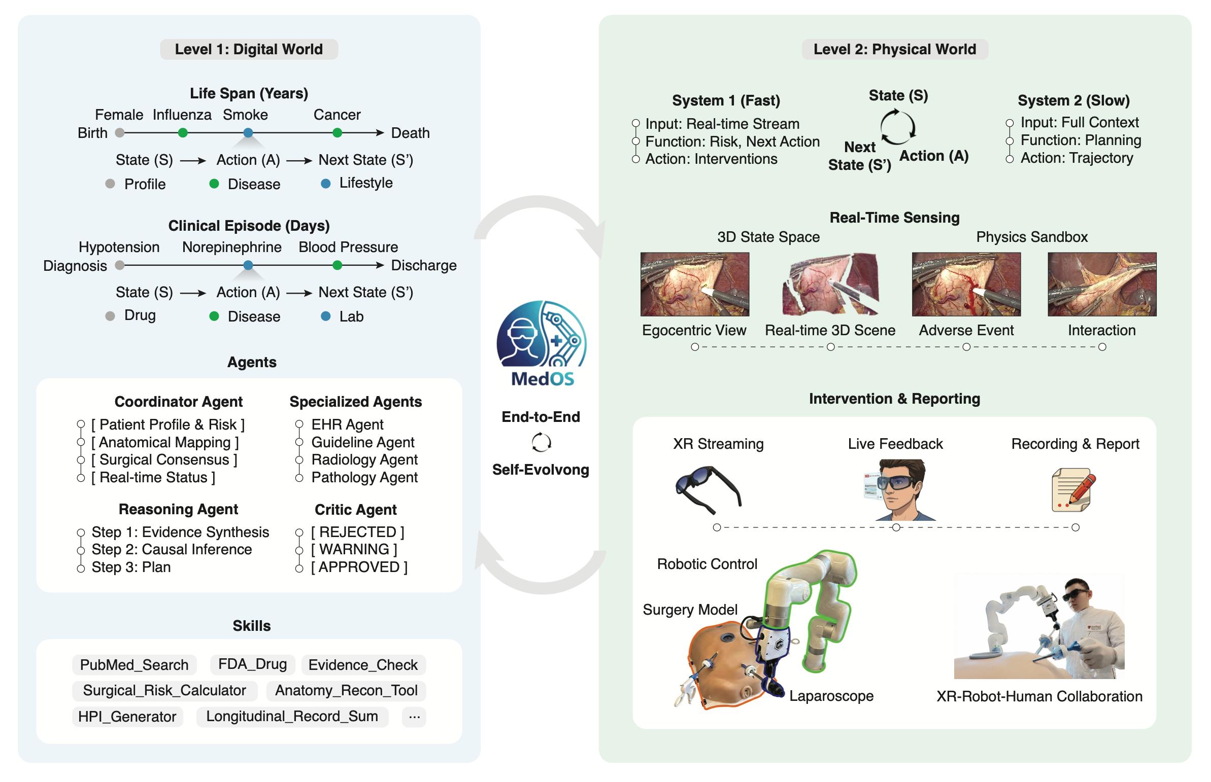 a paper. “We bridge this divide with MedOS, a general-purpose embodied world model. Mimicking human cognition via a dual-system architecture, MedOS demonstrates superior reasoning on biomedical benchmarks and autonomously executes complex clinical research.”