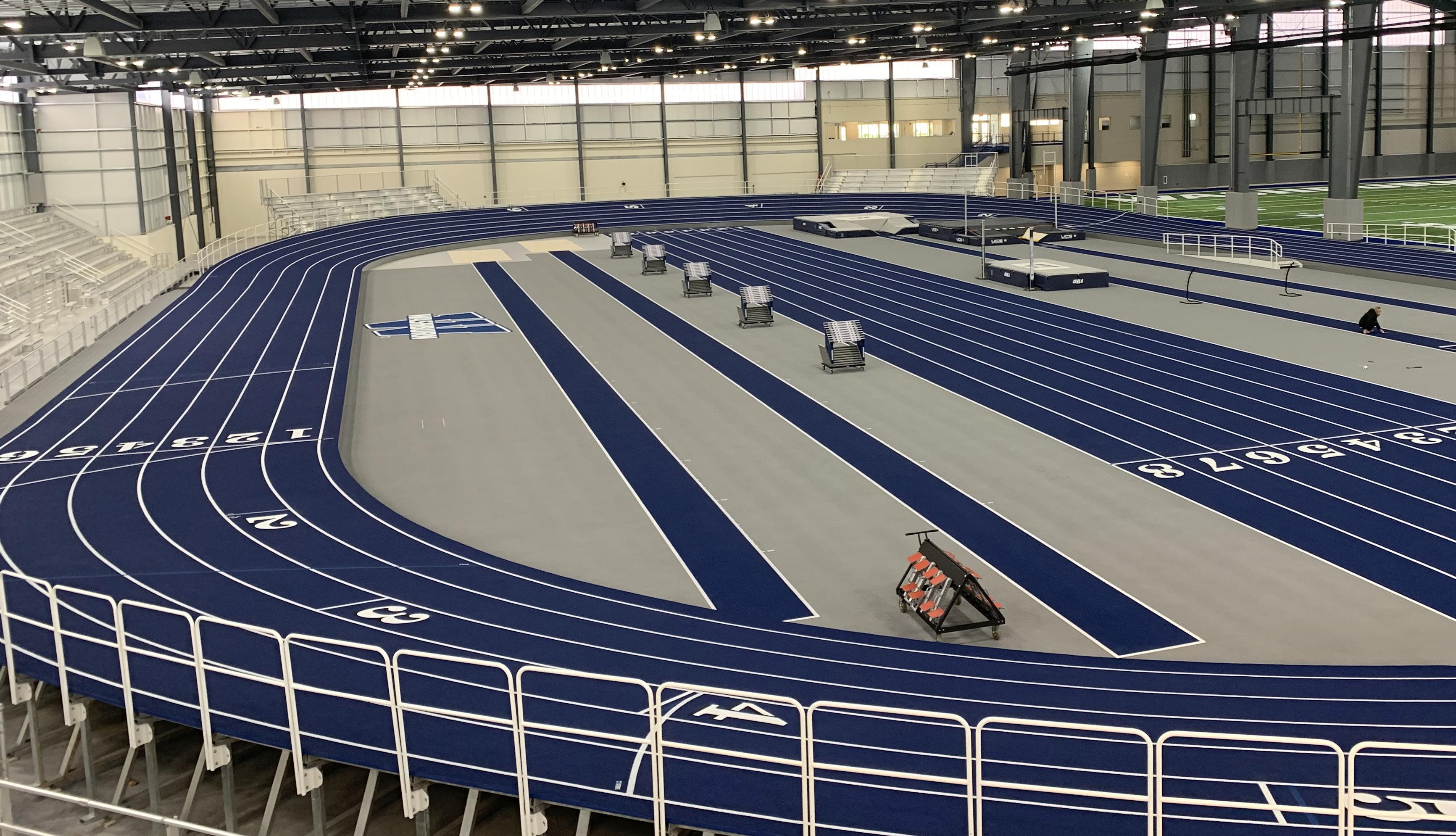 Separated by drop down netting, the indoor track & field side rivals most NCAA Division I facilities, let alone Division II. This climate con trolled facility allows student-athletes complete freedom to train at op timal levels throughout the year. Other features of the track & field side include a 60-meter runway located in the infield, along with designated lanes for jumps and pole vault all surrounded by a 200-meter banked track - the only one in Division II and one of just 28 in all of the NCAA.