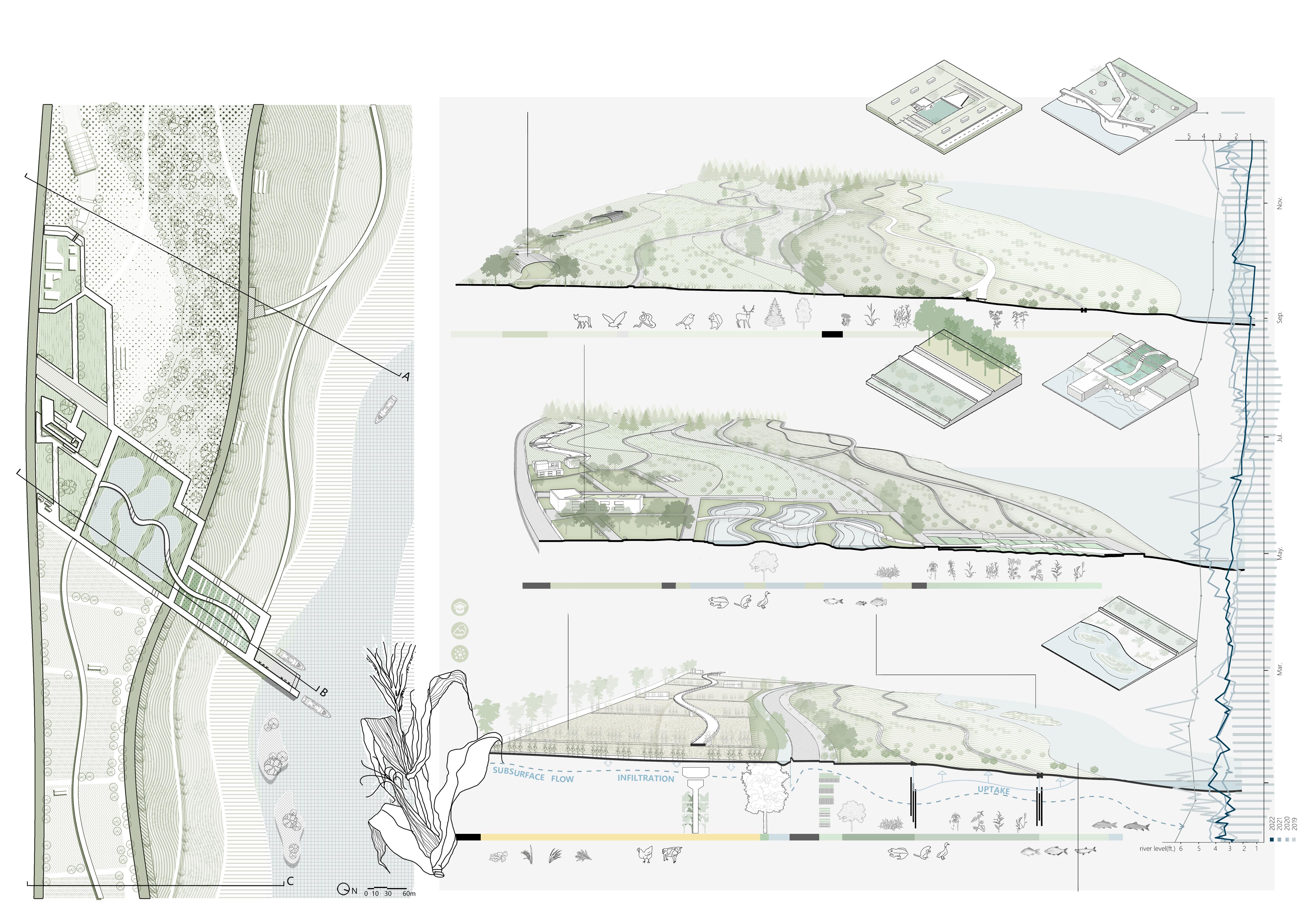 The reconstruction of the riverbank is to set up different forms of water purification areas in combination with the slope, and plant corresponding water purification plants to reduce the remaining pollution from uphill planting. At the same time, combined with the existing condition and local community, a scenic area and waterfront trail are set up to bring new education programs and recreation program.