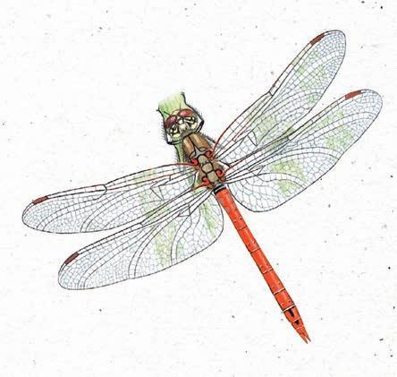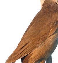 A hunter in pursuit of hunters, there is one elegant falcon whose arrival causes a stir among wildlife and people alike. Kestrel-sized, with a shorter tail and creamy cheeks, the hobby’s long, narrow, pointed wings o en result in it being taken for a giant swi . This summer visitor from Africa relies on remarkable aerobatics to catch prey, and is even able to outmanoeuvre dragonflies, the most agile of insects. What a thrill to witness a mid-air snatch and grab, as the bird speeds towards its prey, locks talons around the hapless dragonfly and proceeds to eat it on the wing. Flying ants, beetles and moths are also on the hobby’s mid-air menu and, once the young hatch, the parents switch to birds such as young and inexperienced martins, starlings and finches.