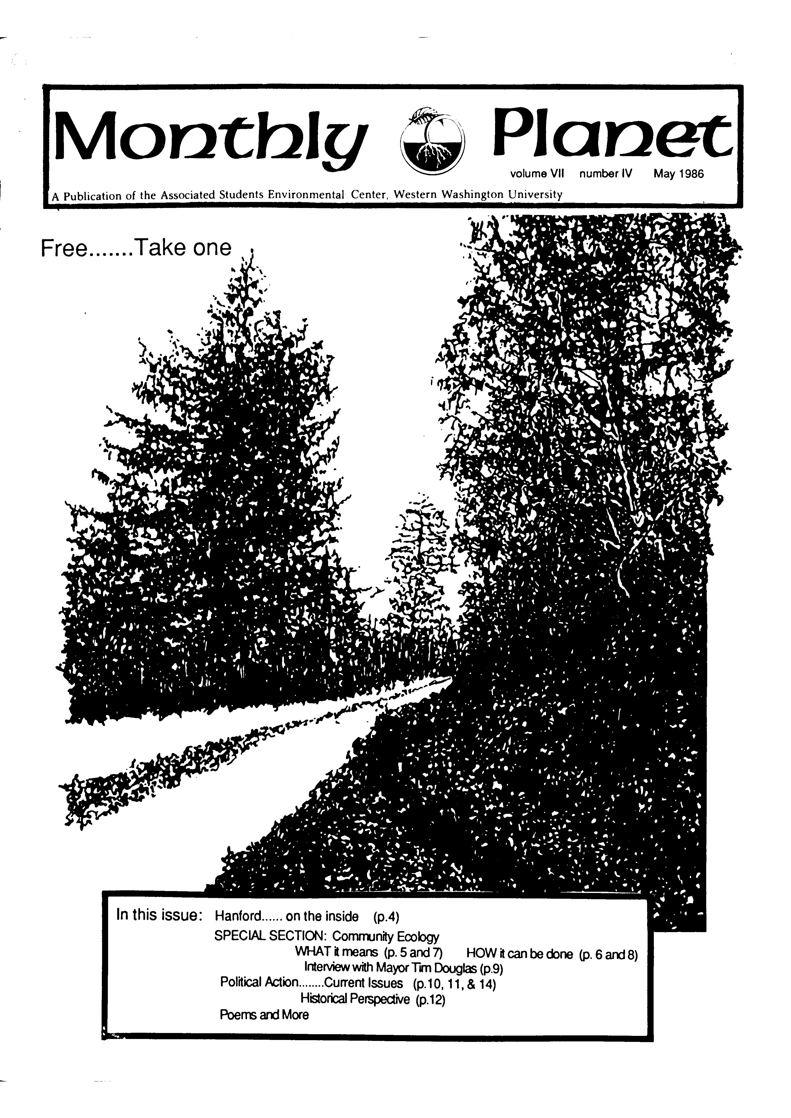 Free .......Take one In this issue: Hanford on the inside (p.4) SPECIAL SECTION: Comrrunity Ecobgy 'NHATl means (p. 5 and 7) HOW tt can be done (p. 6 aro 8) Interview with Mayor Tm Doug~ (p.9) Polltical Action........Current Issues (p.10, 11, & 14) Hsorical Perspective (p.12) Poems and More