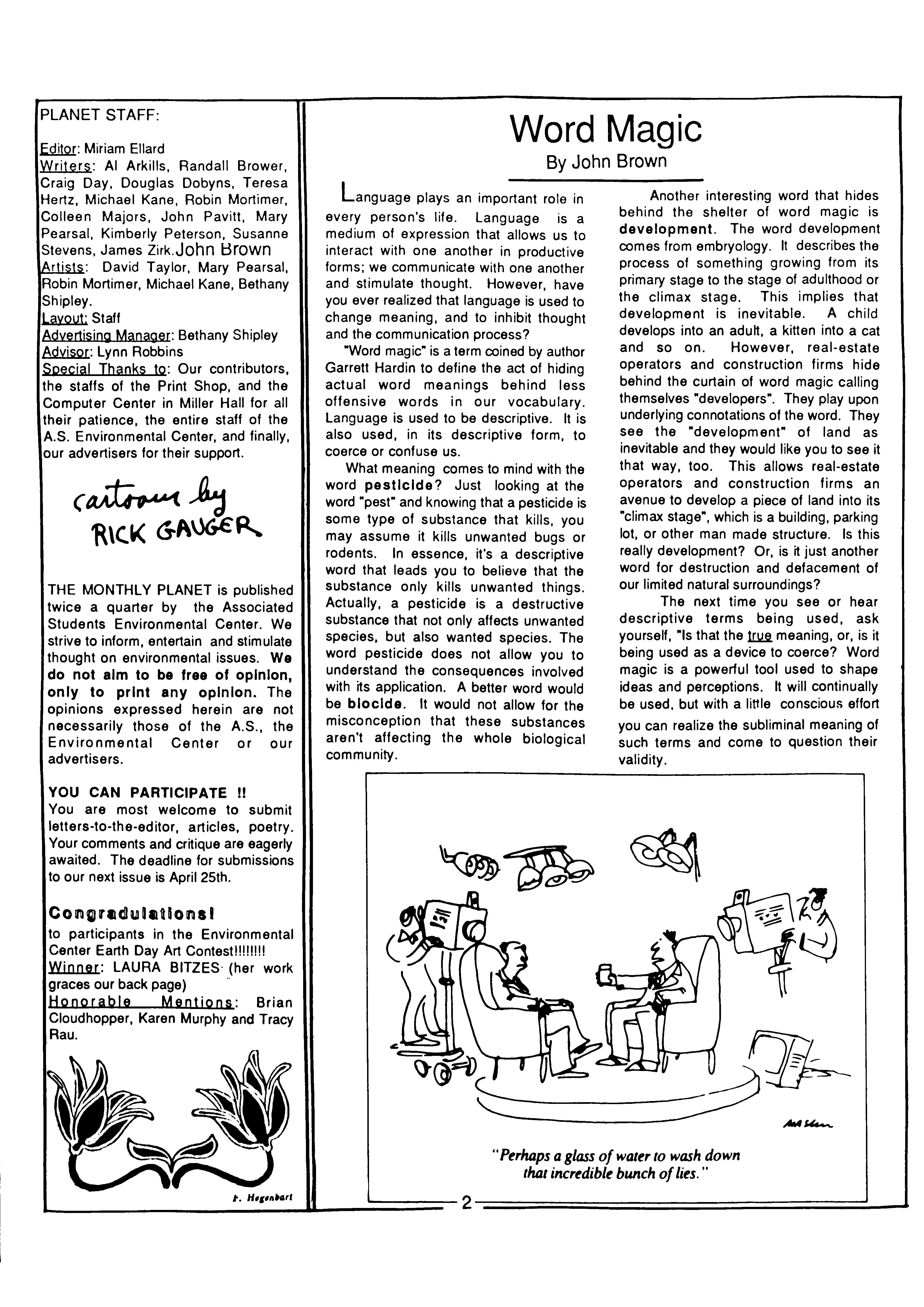 THE MONTHLY PLANET is published twice a quarter by the Associated Students Environmental Center. We strive to inform, entertain and stimulate thought on environmental issues. We do not aim to be free of opinion, only to print any opinion. The opinions expressed herein are not necessarily those of the A.S., the Environmental Center or our advertisers.