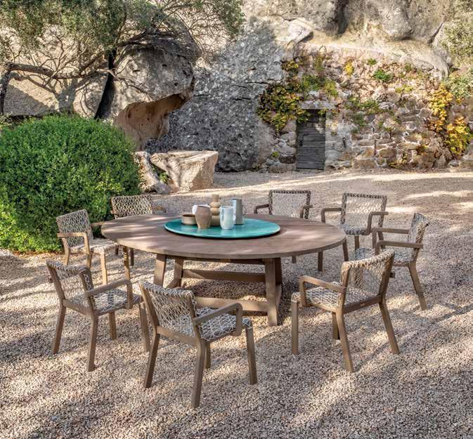 Round and oval dining table with aluminium frame and decorative flat rope. Top tables in Cipollino marble and Travertino. Dining armchairs with frame in natural teak and backrest in woven flat rope. Seating cushions in polypropylene Madre Perla and Deep Green fabrics.