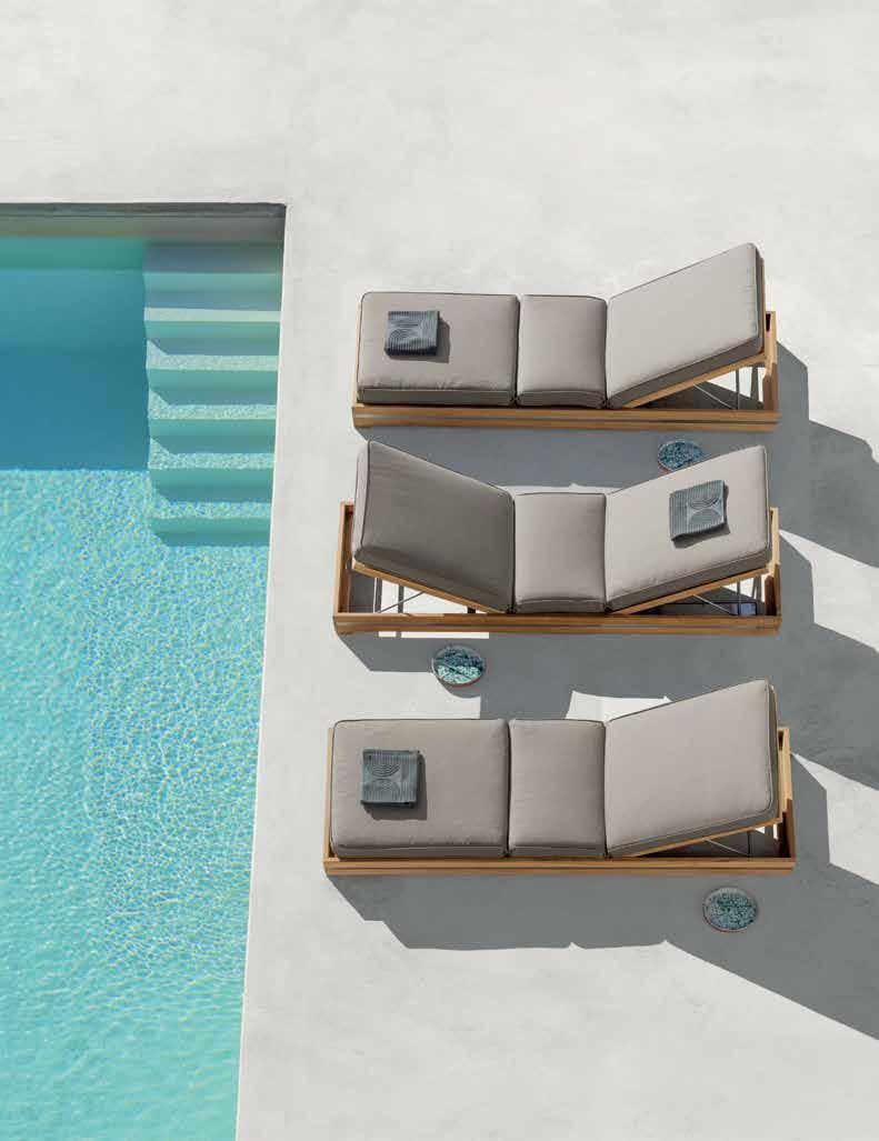 Teak wood makes up the rational profiles of the Sand sunbed. The practical adjustable backrest gives lightness to the structure accentuating its comfort.