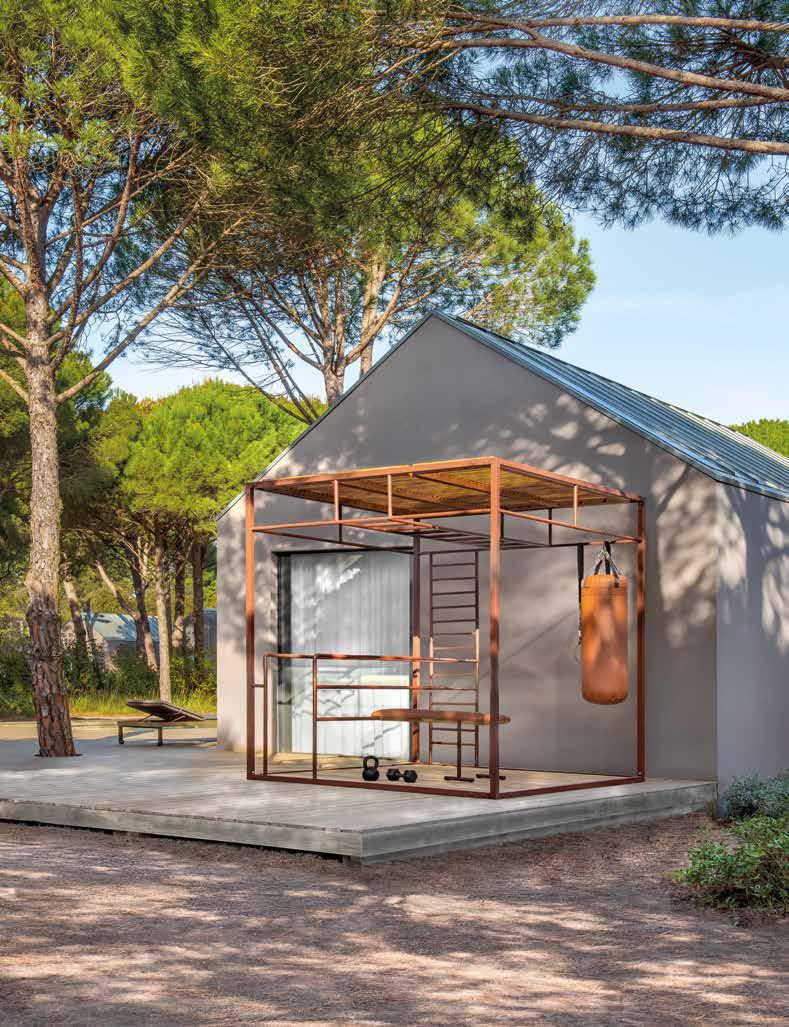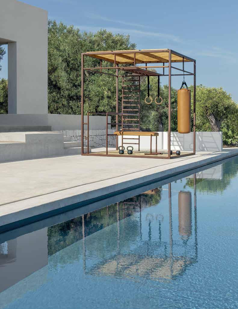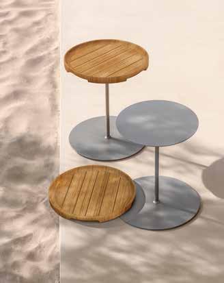 The combination of teak and metal also characterizes armchairs and dining tables, in different shapes and sizes, as well as stools and poufs, completing the collection and creating perfect moments of conviviality in open air. The lounge bed is like a nest that embraces body and mind.