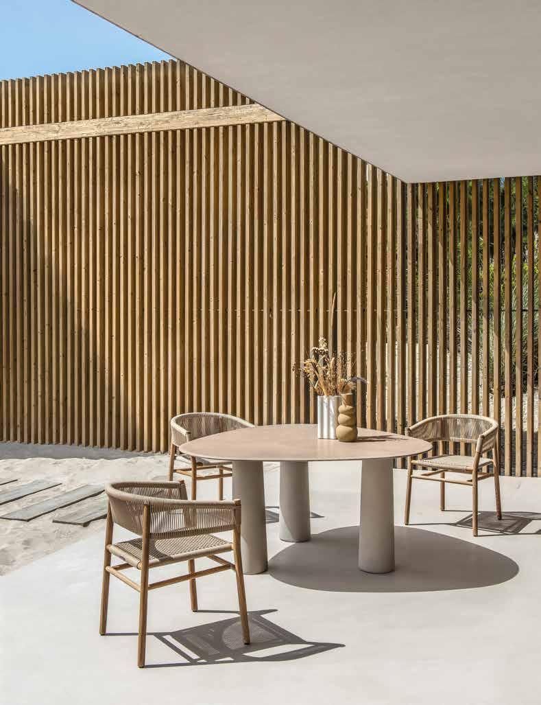Pluvia armchair with seat in Round Rope Light Grey, or Natwick Sand Beige, and frame in Warmwhite aluminium / Concreto round dining table with frame in Warmwhite aluminium and base in concrete. Top table in natural teak.
