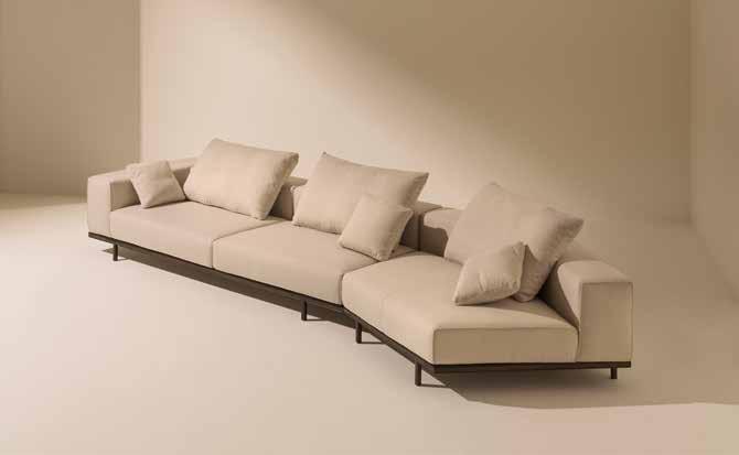 The aluminium of the frame creates a soft alternation of solids and voids, emphasising the light design that characterises the entire collection. The dining set evokes the colours of the mineral world and the material difference between the table top and the frame has a pleasant visual continuity. Mineral grey and limestone white enhance the cosy shapes of the lounge sets where the soft cushions recall the colours of stone and earth. The low side tables complement the modularity of the daybeds offering a sensation of well-being.