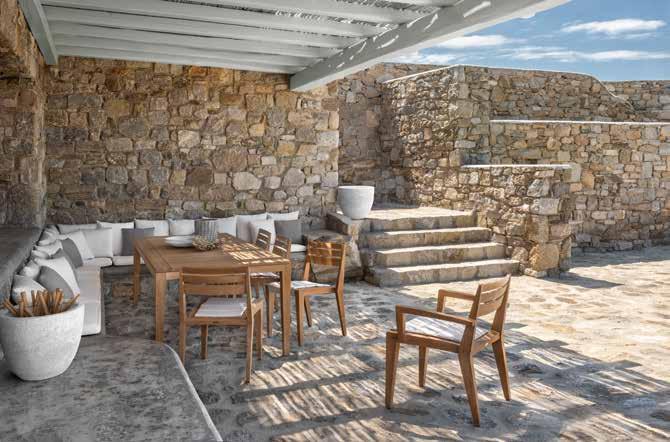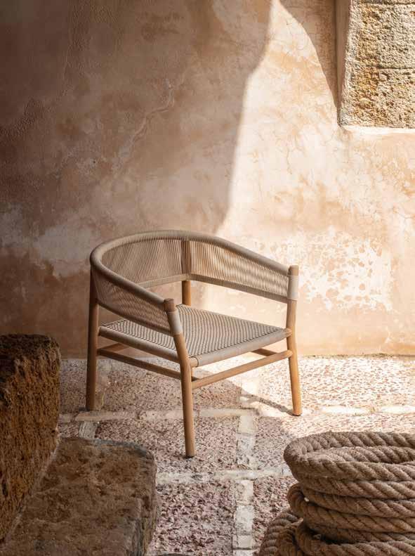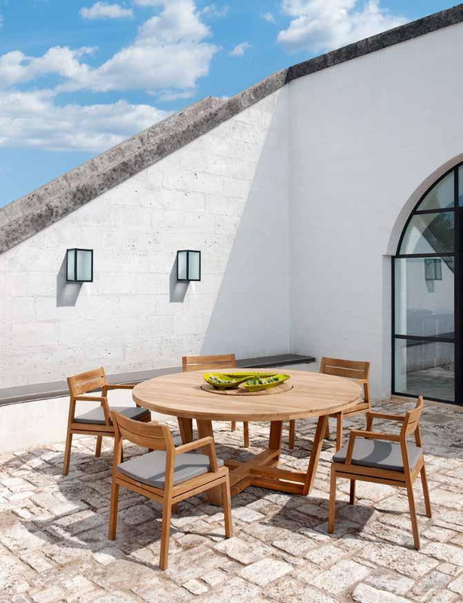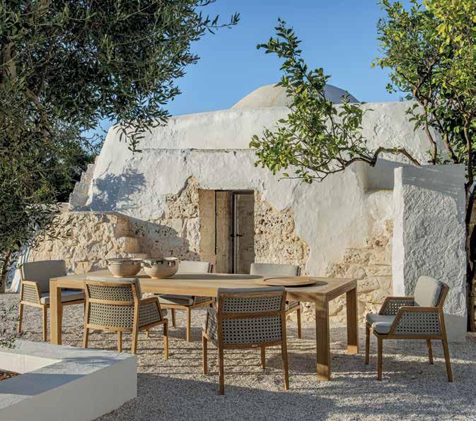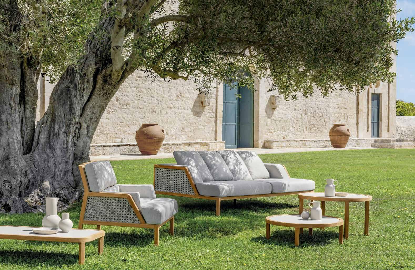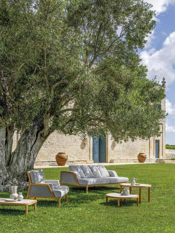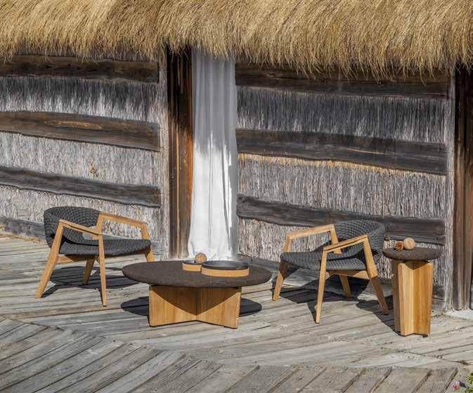it / Materia e spirito. L’intreccio fra tradizioni ancestrali e geometrie rigorose dà forma a una nuova collezione lounge e dining. I colori della natura mediterranea, così vitali e ispiratori, vestono di motivi inediti forme sapienti nel loro equilibrio, ricercate nell’ispirazione e nella realizzazione. Strutture in legno di teak ricordano antichi telai, marmo e pietra lavica raccontano storie materiche.