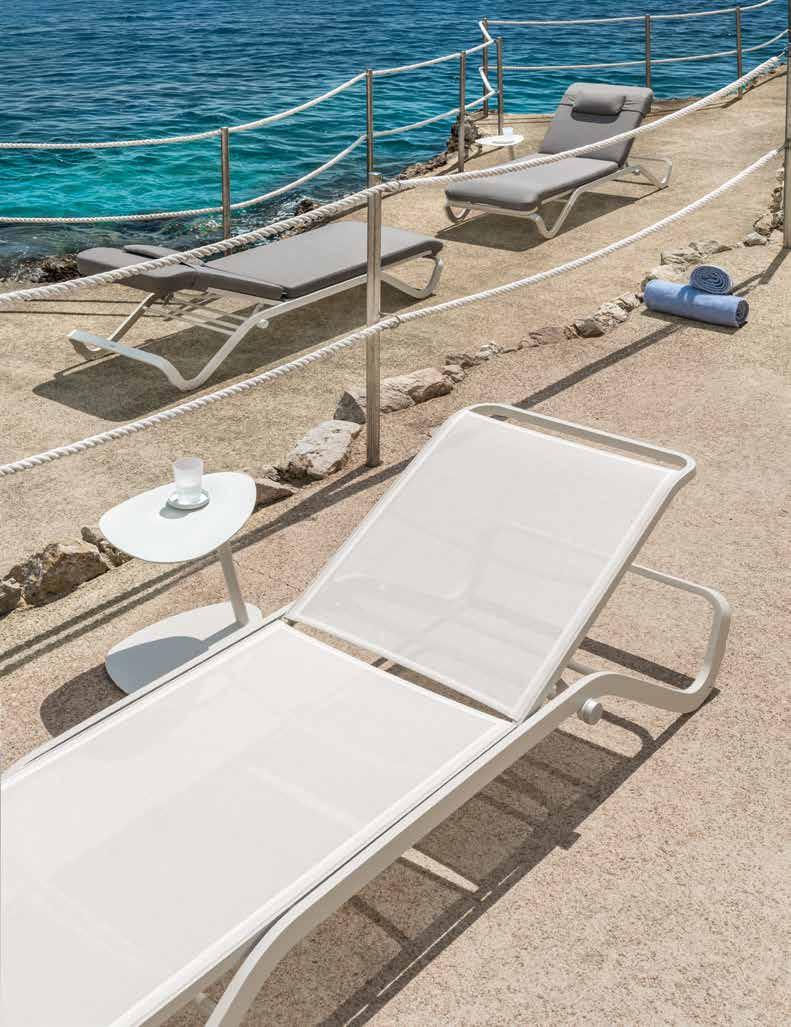 Sun loungers in aluminium and Ethitex fabric. Smart side table.