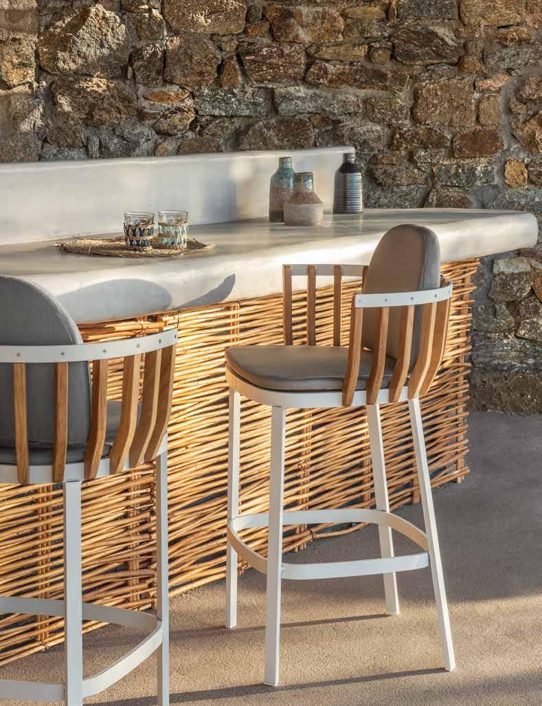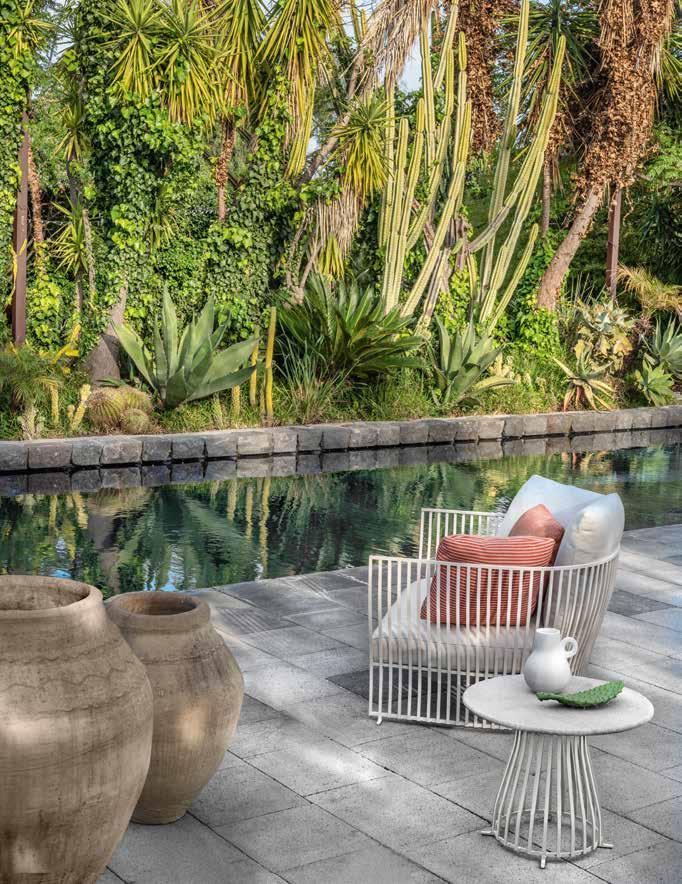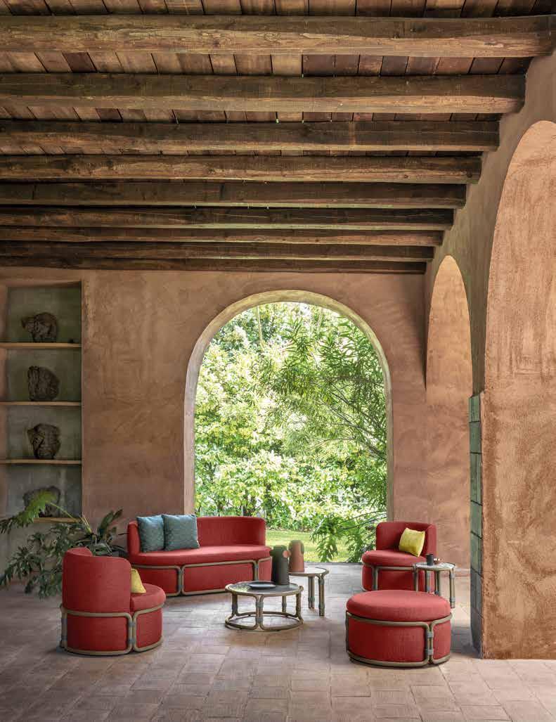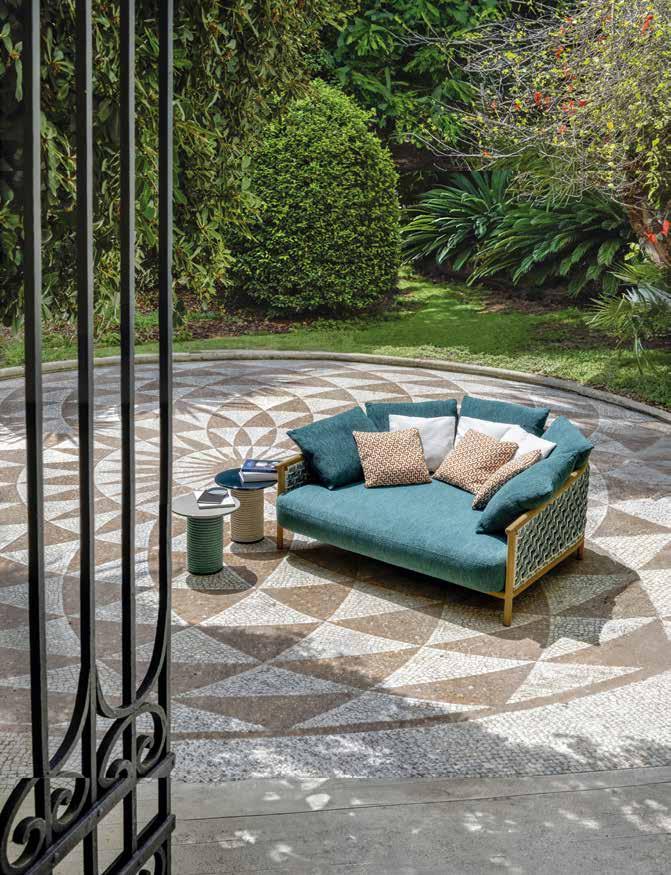 A new idea of outdoor living inspired by traditional bamboo bending, where the frame in pickled teak or aluminium is modelled into sinuous shapes that embrace the refined padded upholstery that supports the seating. Rope is an elegant detail that unites and decorates. The coffee table tops combine extraordinary creativity in use of colour with traditional marble and stone craftsmanship. Made entirely by hand, they generate fabulous patterns and compositions, some inspired by the Palladian technique.