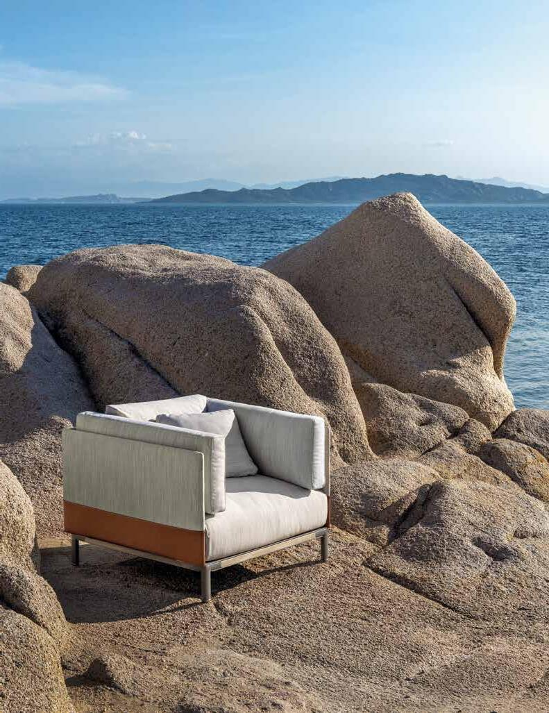 Cushions in Maiorca fabric / Costiera sofa and armchair with carbon aluminium frame and teak inserts. Cushions in Cruise fabric.