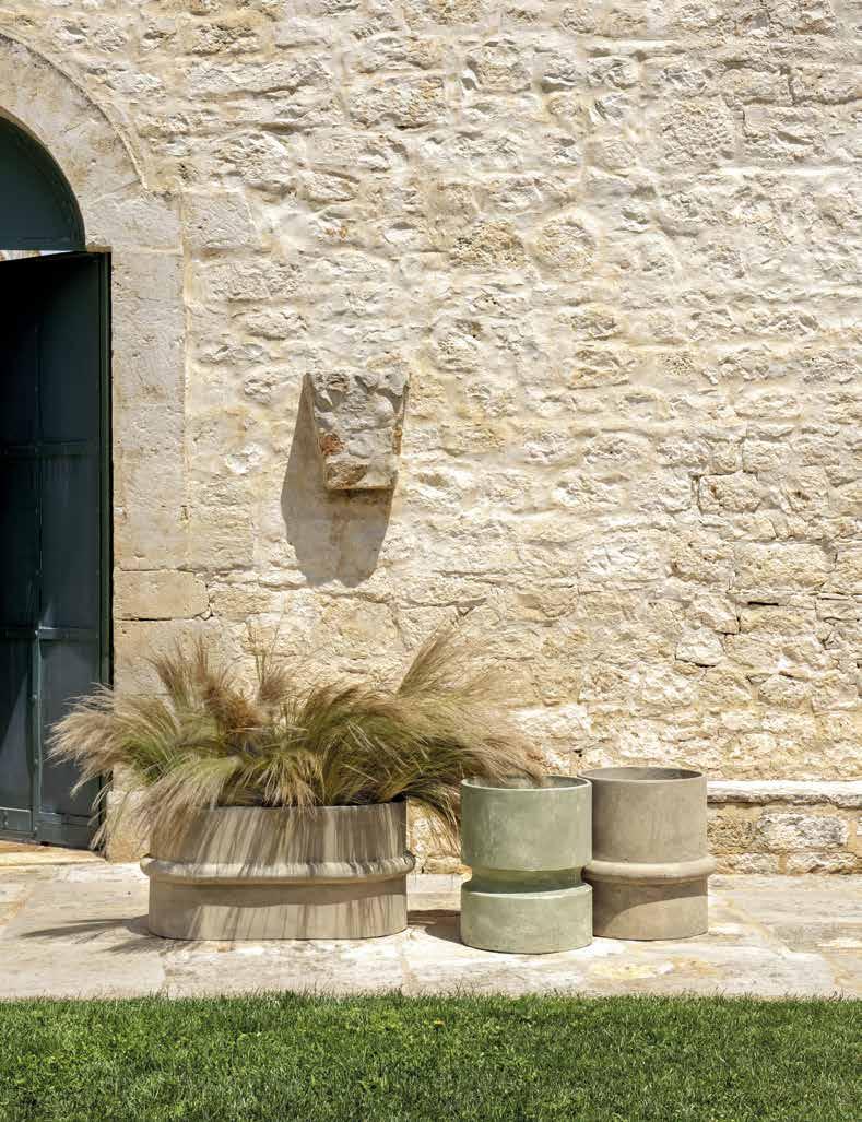 An encounter of volumes that connect in the landscape of the home, dialogue between contemporary materials and natural sensations. Devised to be used in pairs or in groups, the vases in the Innesti collection have complementary shapes that allow them to be arranged quite freely, creating a different compositions each time. The special concrete used to make them lends sophisticated texture.