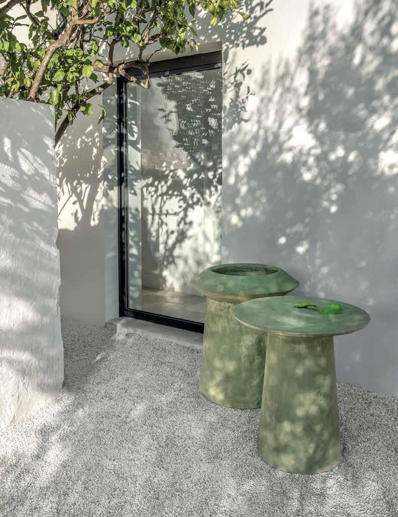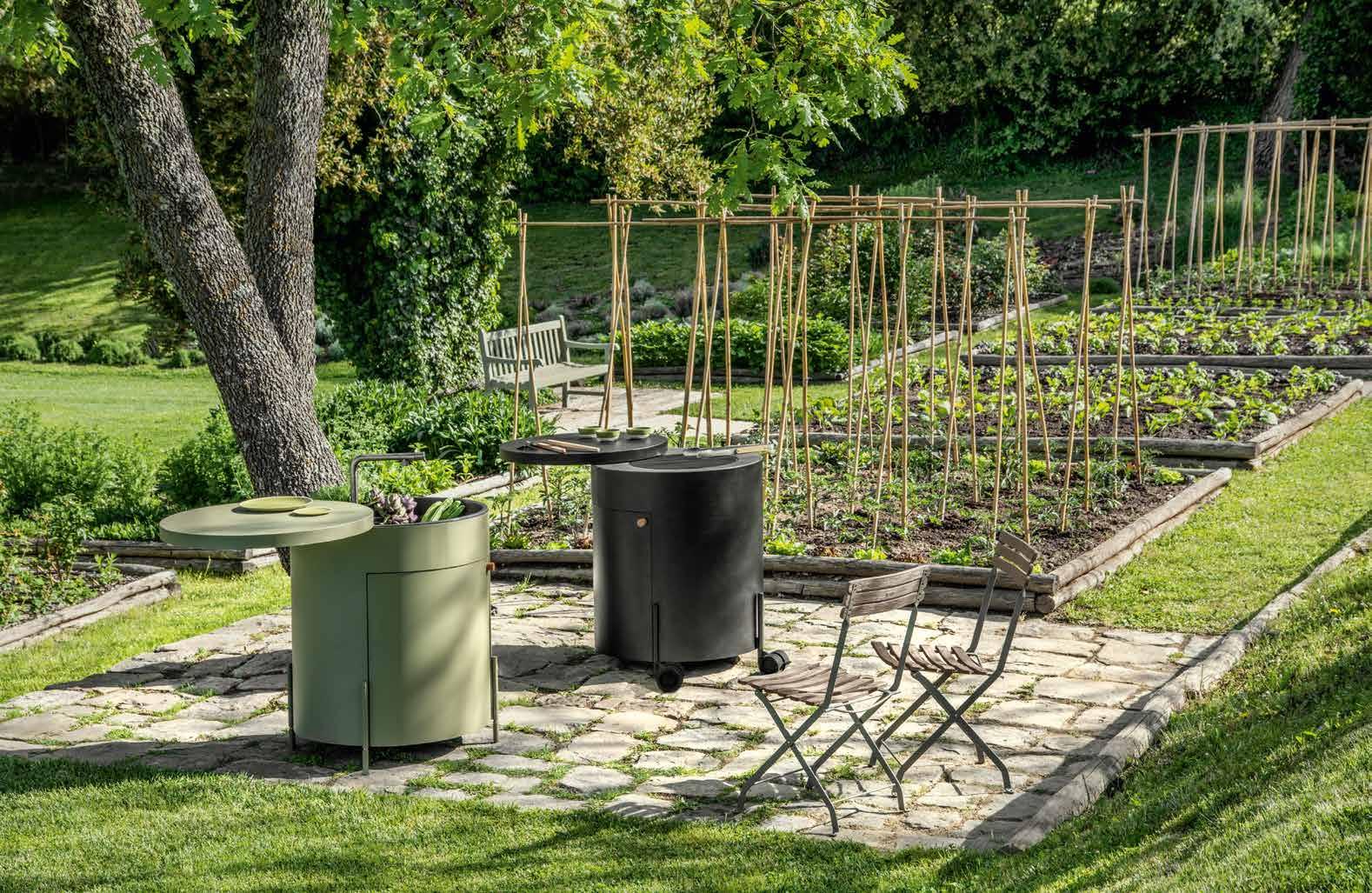 Inspiration for the tables in the Patio collection comes from the mooring bollards that boat ropes are wrapped around. The dining tables have tops in Cipollino marble and travertine, materials used for thousands of years in furnishings and architecture. Whereas the coffee tables are made with tops in enamelled lava stone, in a deep vibrant colour.