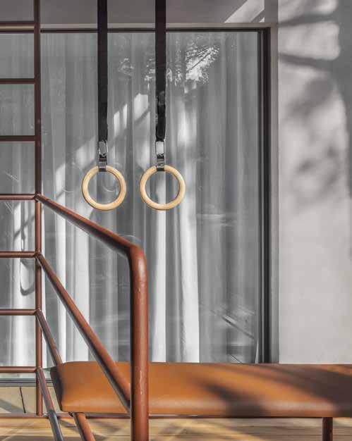 The light filters the teak slats, creating fascinating dialogue between matter and illumination, outdoor settings and interior situations.